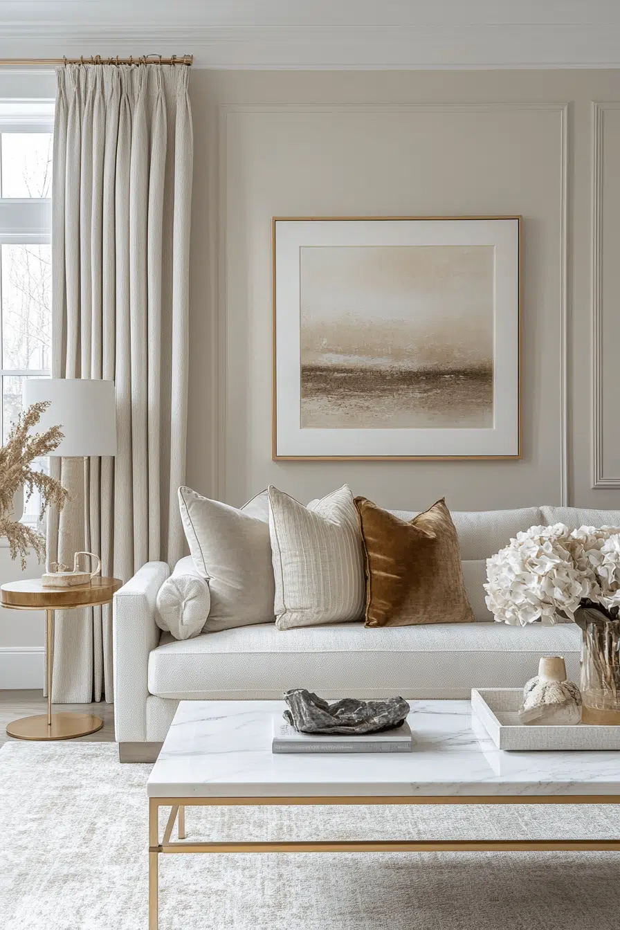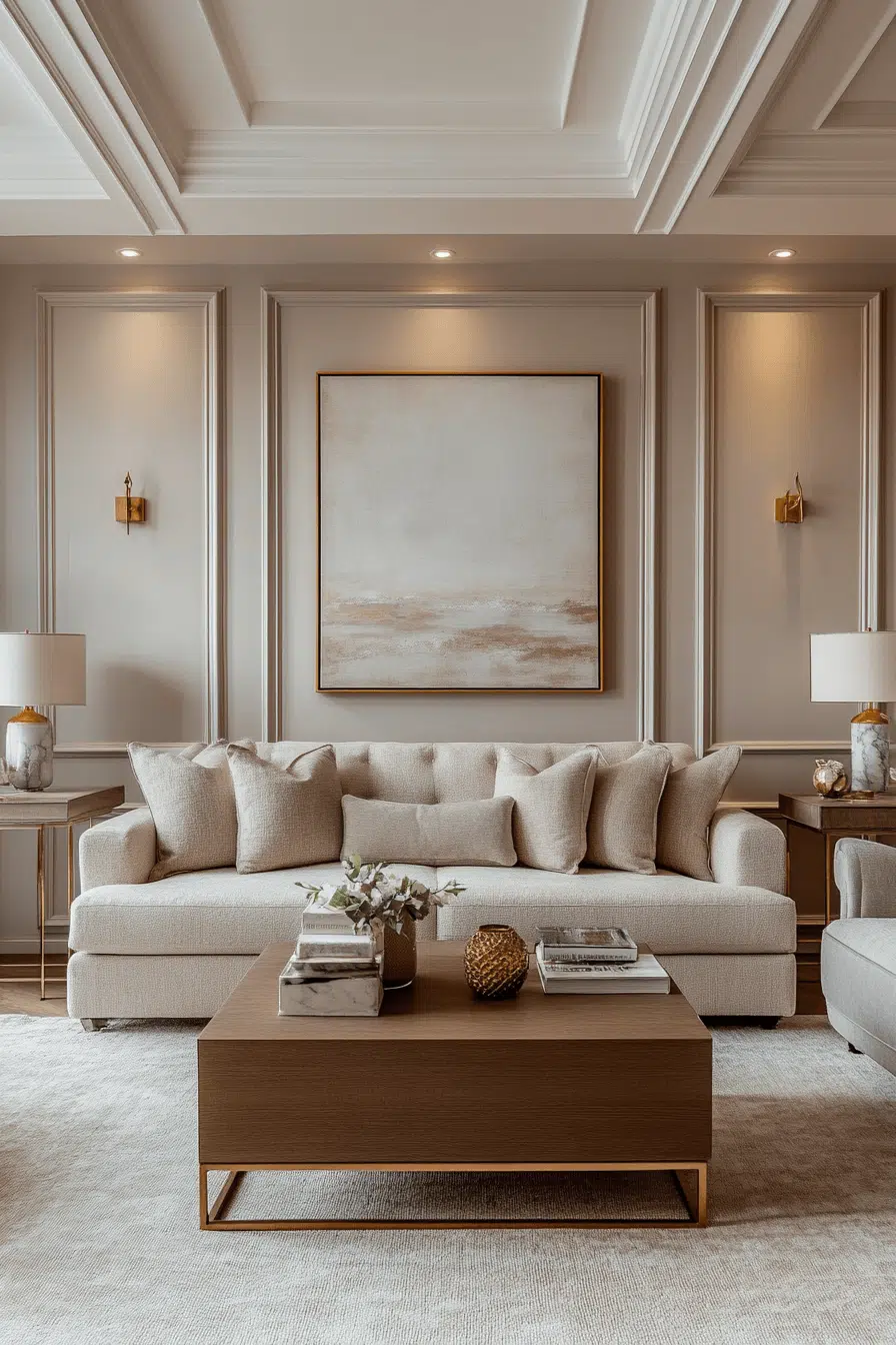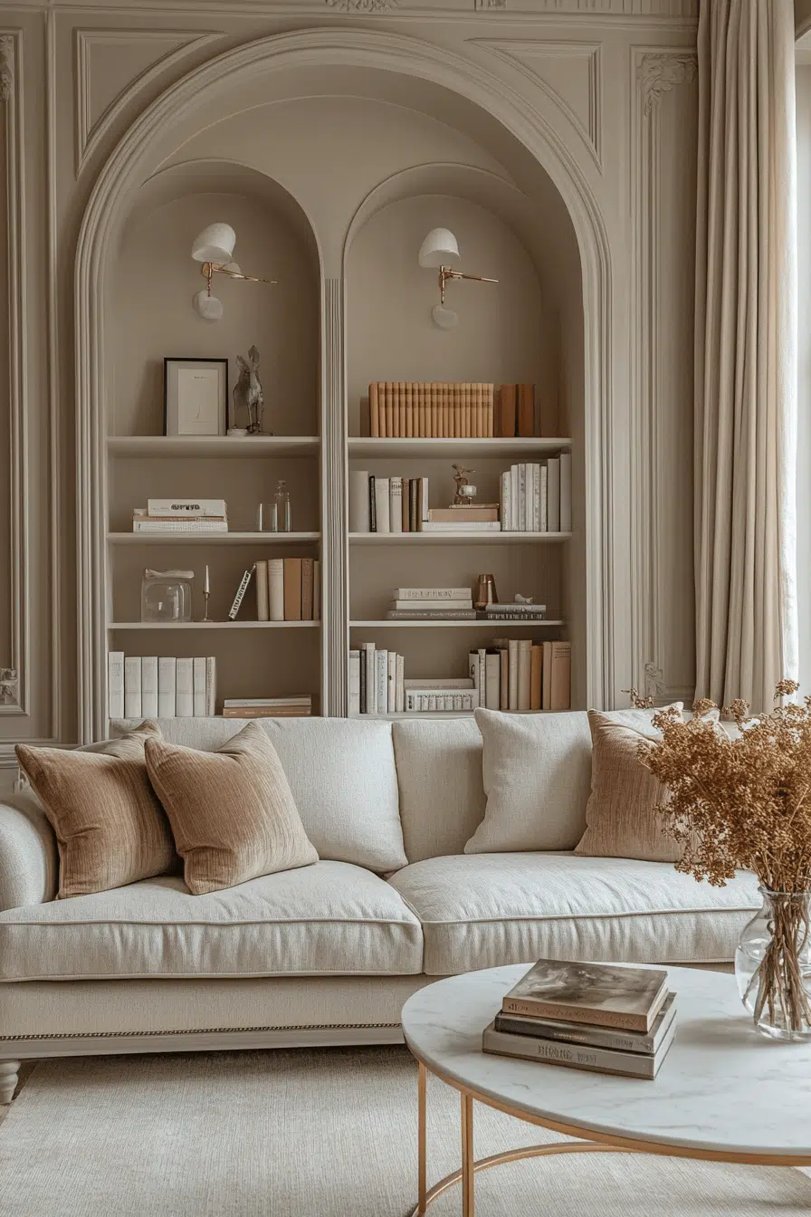 Neutral tones enhanced by geometric accents shape this Neo Deco living room with understated charm. Taupe and ivory create a soothing base. Chevron patterns and arch motifs add structure. Metallic highlights deepen the palette subtly. The aesthetic feels calm yet captivating. Reimagine neutrals with Deco-inspired detail!