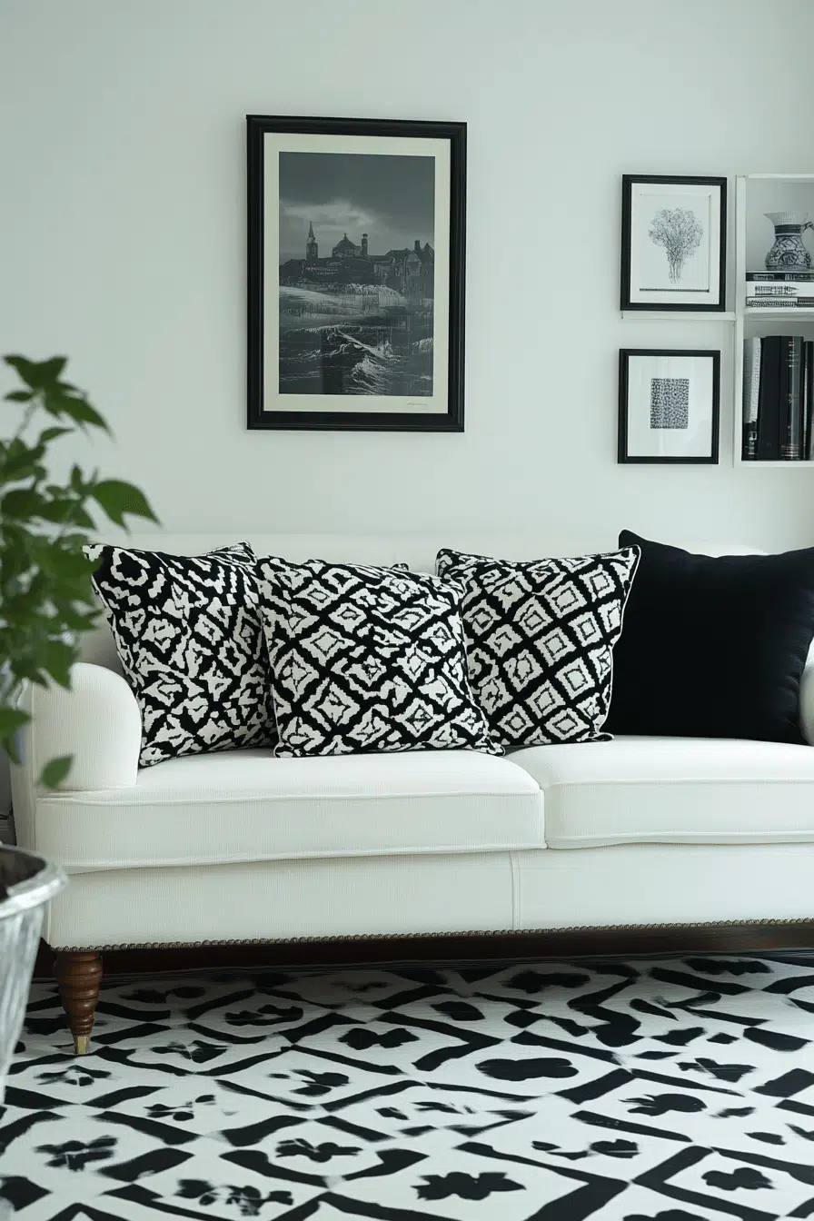A restrained black, ivory, and graphite palette anchors this Neo Deco living room in timeless contrast. Clean lines and graphic motifs highlight architectural symmetry. Metallic accents introduce depth without disrupting the minimalist feel. Checkerboard patterns and framed panels reinforce the Deco influence. The aesthetic is streamlined yet striking. See how monochrome delivers maximum impact!