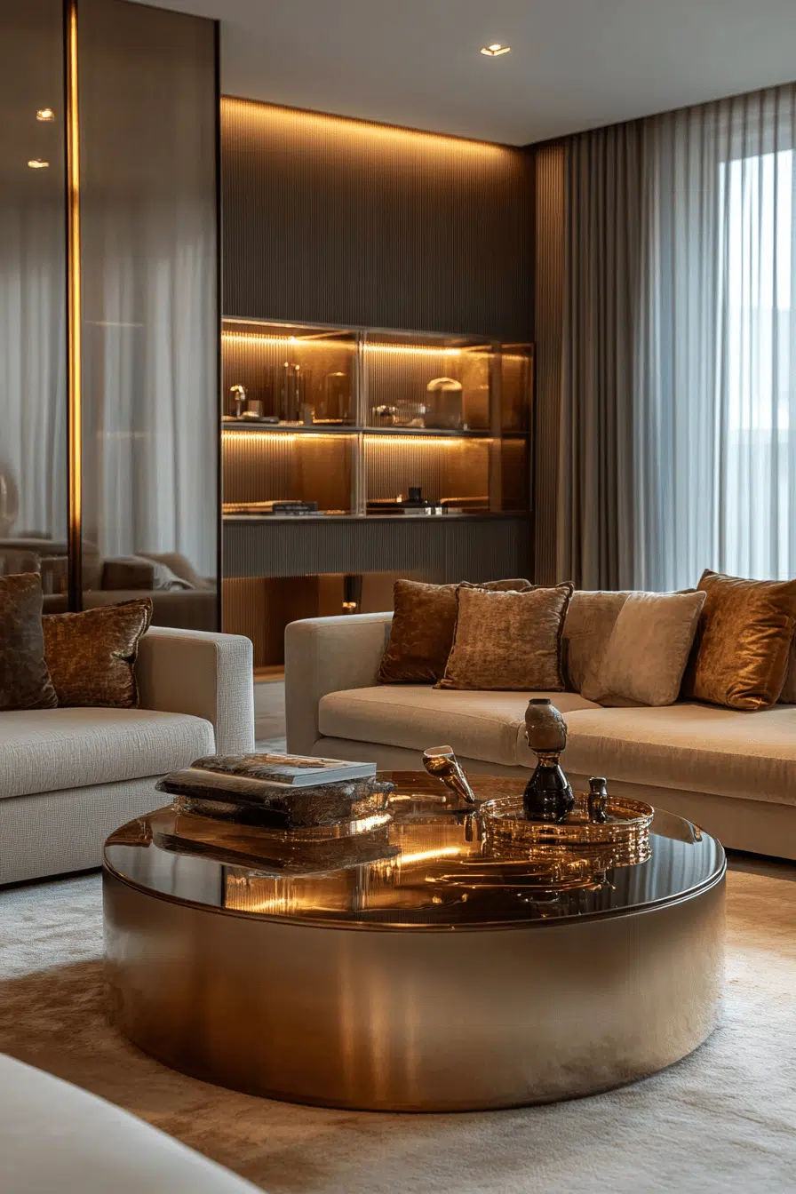 The beauty of Neo Deco living room design lies in its fearless embrace of drama—whether it’s the sharp angles that command attention, the metallic accents that catch the light, or the sophisticated seating that invites both relaxation and admiration. Each element works together to create an atmosphere of pure glamour and refined elegance.