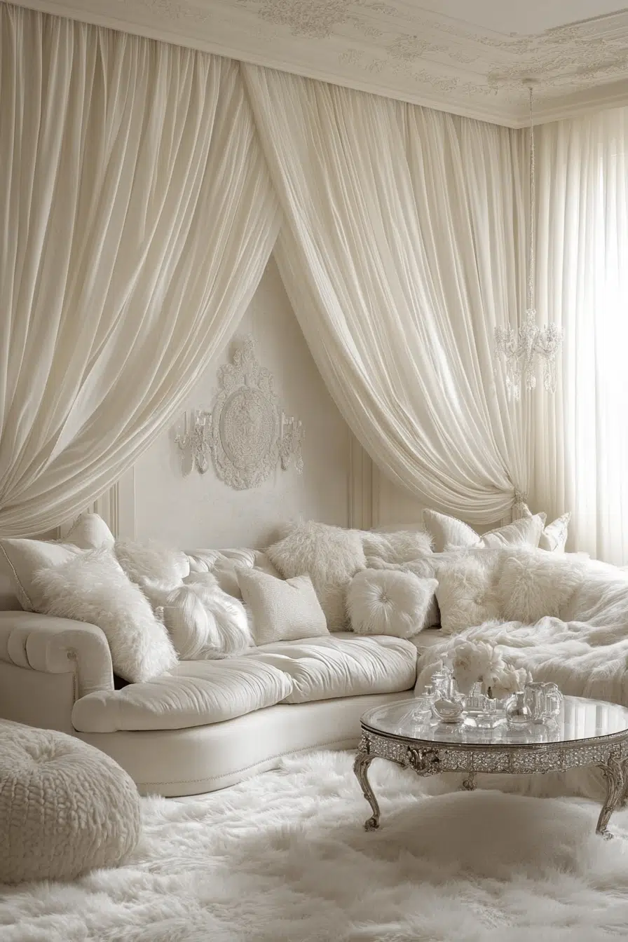 Opalescent fabrics and iridescent finishes add ethereal glamour to this Neo Deco living room. Pearly tones glow subtly against brass and chrome details. Mirrored surfaces amplify the light. The space feels delicate yet impactful. It’s understated shine with captivating presence. Step into this luminous pearl-inspired retreat!