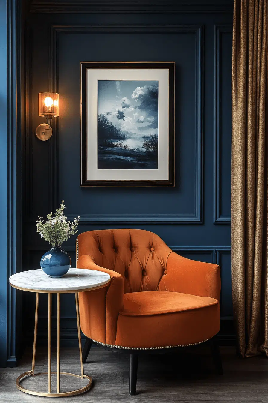 Midnight navy envelops this Neo Deco living room in dramatic richness. Warm metallic highlights add depth against the dark base. Plush seating and bold shapes enhance the luxurious mood. Sculptural lighting completes the atmosphere. The design feels regal yet modern. Embrace the allure of deep blue sophistication!