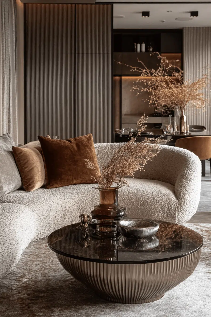 Curvilinear furniture silhouettes bring effortless flow to this Neo Deco living room. Rounded ottomans and soft-edged tables contrast beautifully with angular accents. Velvet upholstery enhances depth and comfort. Metallic details punctuate the composition thoughtfully. The balance feels harmonious and chic. Witness how curves redefine modern comfort!