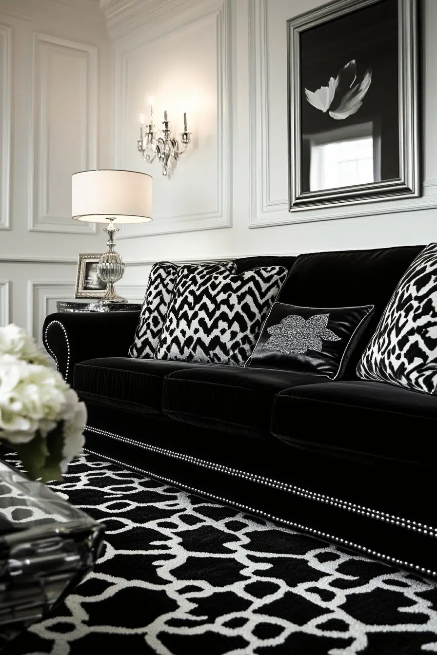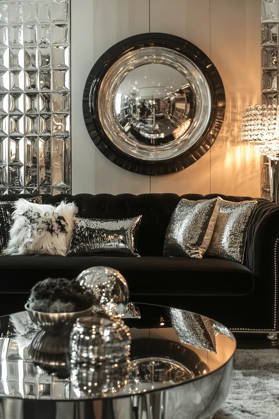Bold black-and-white contrasts animate this Neo Deco living room with graphic flair. Patterned textiles and reflective accents add dimension to the neutral base. Each element feels purposeful and balanced. The interplay of texture and shine creates dynamic energy. It’s sharp yet inviting. Feel inspired by fearless contrast!