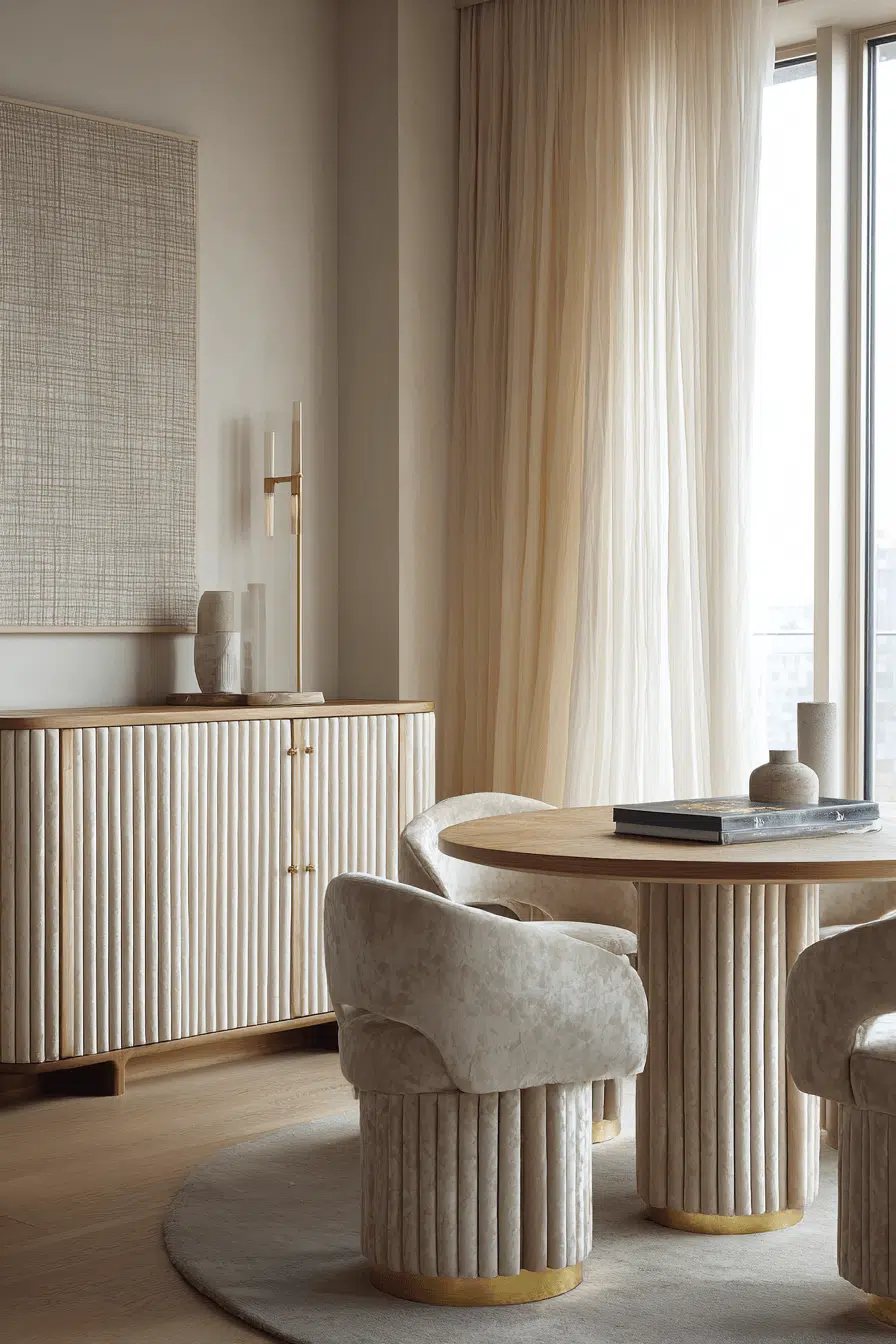 Fluted textures and ribbed surfaces add rhythmic depth to this Neo Deco living room. Paneled walls and sculptural consoles create movement. Matte finishes soften architectural strength. The aesthetic feels tactile and timeless. It honors Deco heritage in a contemporary way. Discover the beauty of textured rhythm!