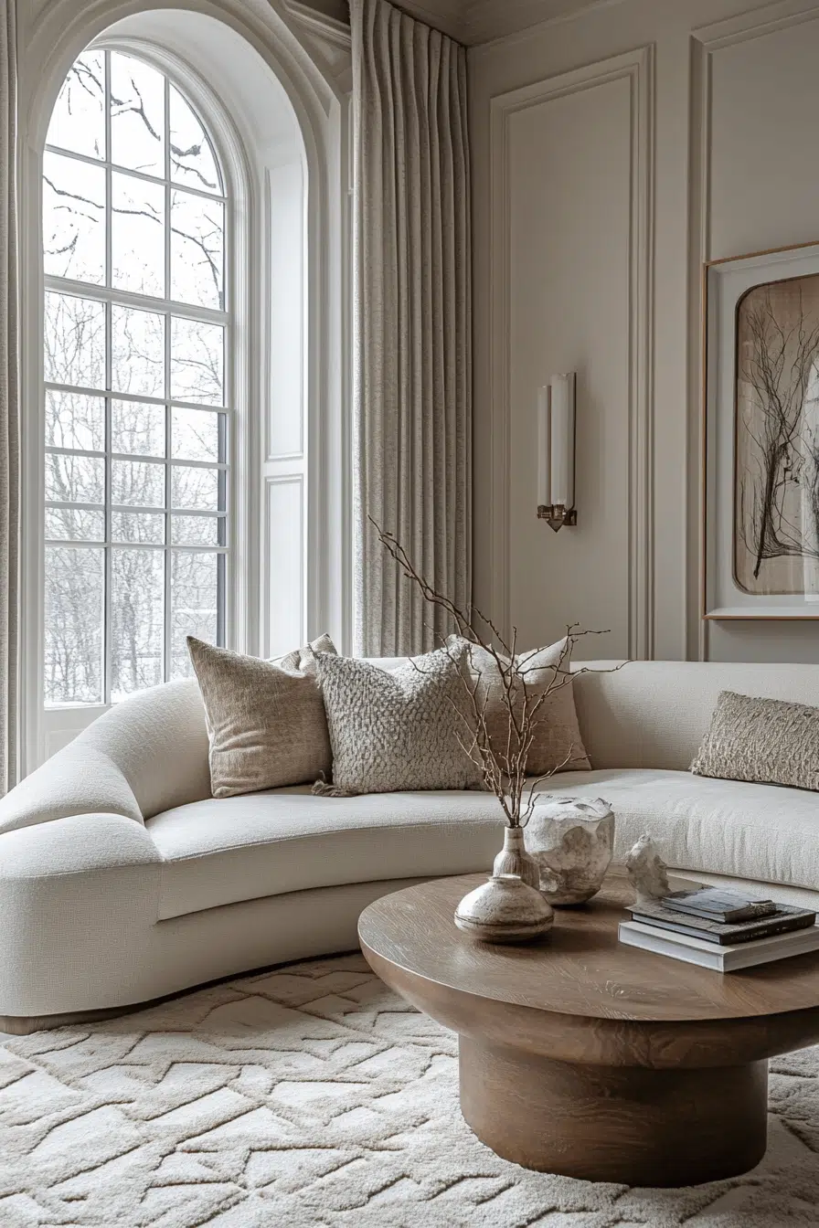 Graceful arches and curved frameworks soften this Neo Deco living room’s geometric base. Neutral palettes enhance the sense of calm. Subtle metallic highlights add dimension without excess sparkle. The space flows seamlessly from one zone to the next. It’s a serene twist on a bold aesthetic. Embrace the elegance of flowing forms!