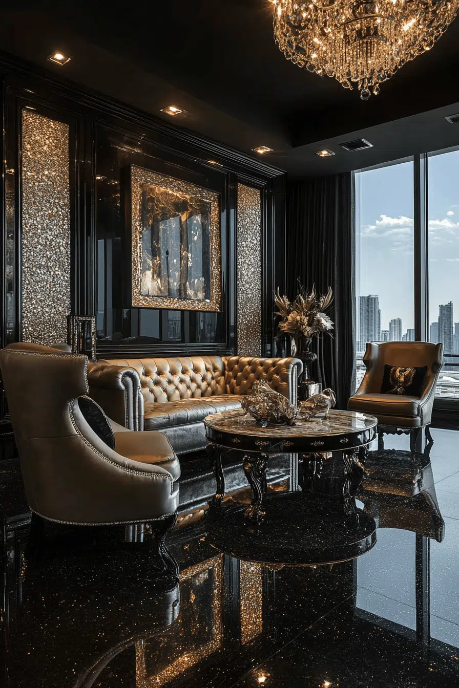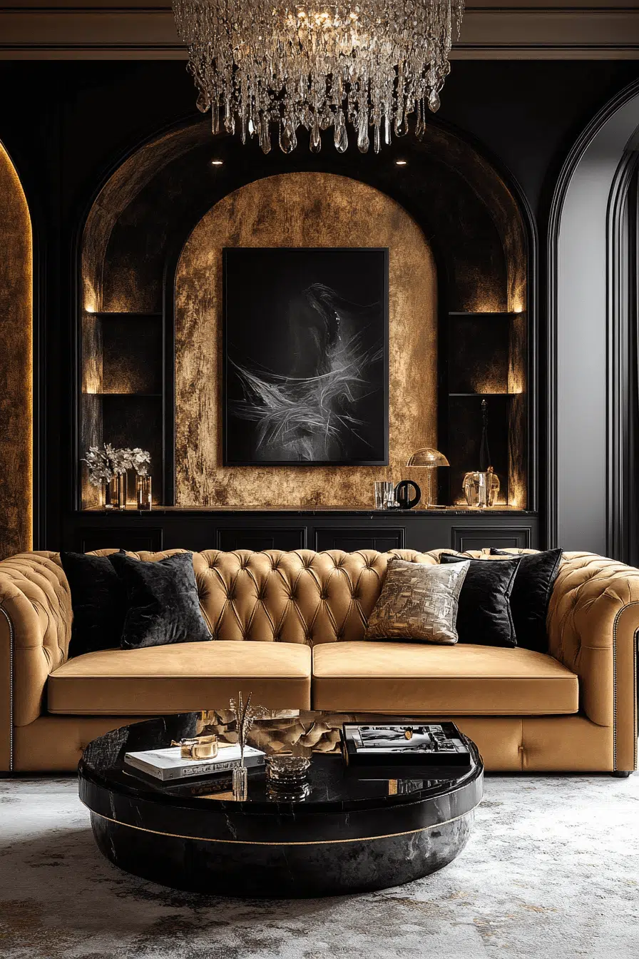 Layered fabrics and gleaming accents enrich this Neo Deco living room with dramatic depth. Dark upholstery meets gold-framed mirrors and sculptural lighting. Textured textiles enhance dimension throughout. The aesthetic feels opulent yet disciplined. It invites both admiration and relaxation. Delight in this richly layered design!