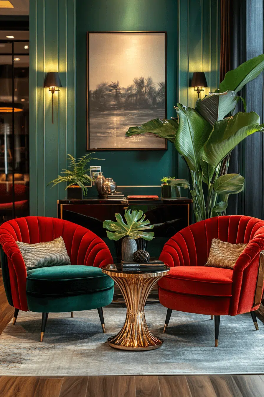 Sapphire, emerald, and garnet tones energize this Neo Deco living room with bold character. Jewel-toned seating pairs seamlessly with warm brass details. Geometric cushions and statement artwork amplify the drama. The palette feels vibrant, expressive, and luxuriously layered. Every element radiates confidence. Indulge in this rich spectrum of Deco-inspired color!