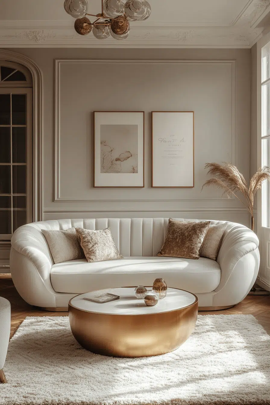 Sweeping curves and velvety upholstery create a fluid, enveloping Neo Deco living room atmosphere. Rounded sofas, circular rugs, and arched alcoves encourage visual flow. Rich textures heighten the sensory experience without overwhelming the layout. Subtle gold lighting enhances the warmth of the space. The result feels graceful yet confident. Experience how curves transform modern elegance!