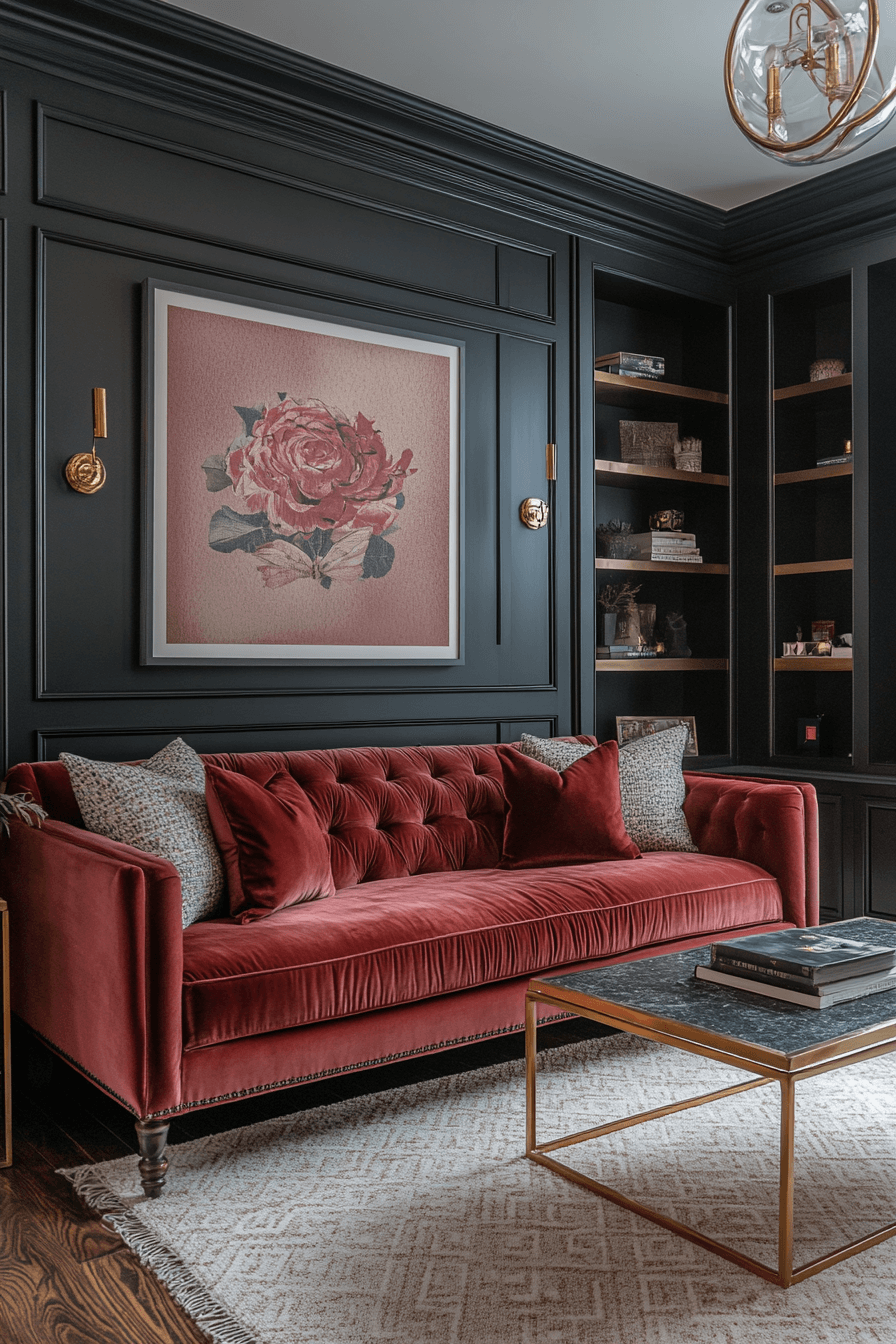 Deep charcoal walls and midnight furnishings establish a moody Neo Deco living room backdrop. Glossy finishes and golden lighting fixtures illuminate the darker tones. Velvet textures provide warmth and tactile richness. Sculptural décor enhances the dramatic effect. The atmosphere feels intimate and polished. Immerse yourself in this refined noir setting!