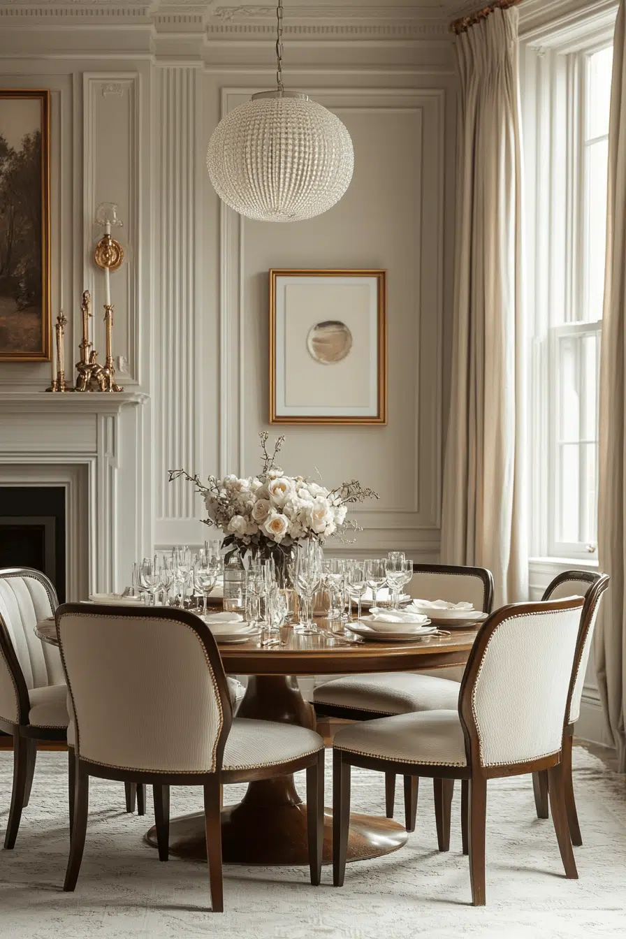 A round pedestal table enhances intimacy within a neoclassical dining room, softening linear architecture. The sculptural base becomes a focal point beneath symmetrical lighting. Upholstered chairs add comfort and refinement. A tailored rug grounds the setting elegantly. The space feels conversational and balanced. Tap to embrace graceful curves in your neoclassical dining room layout!