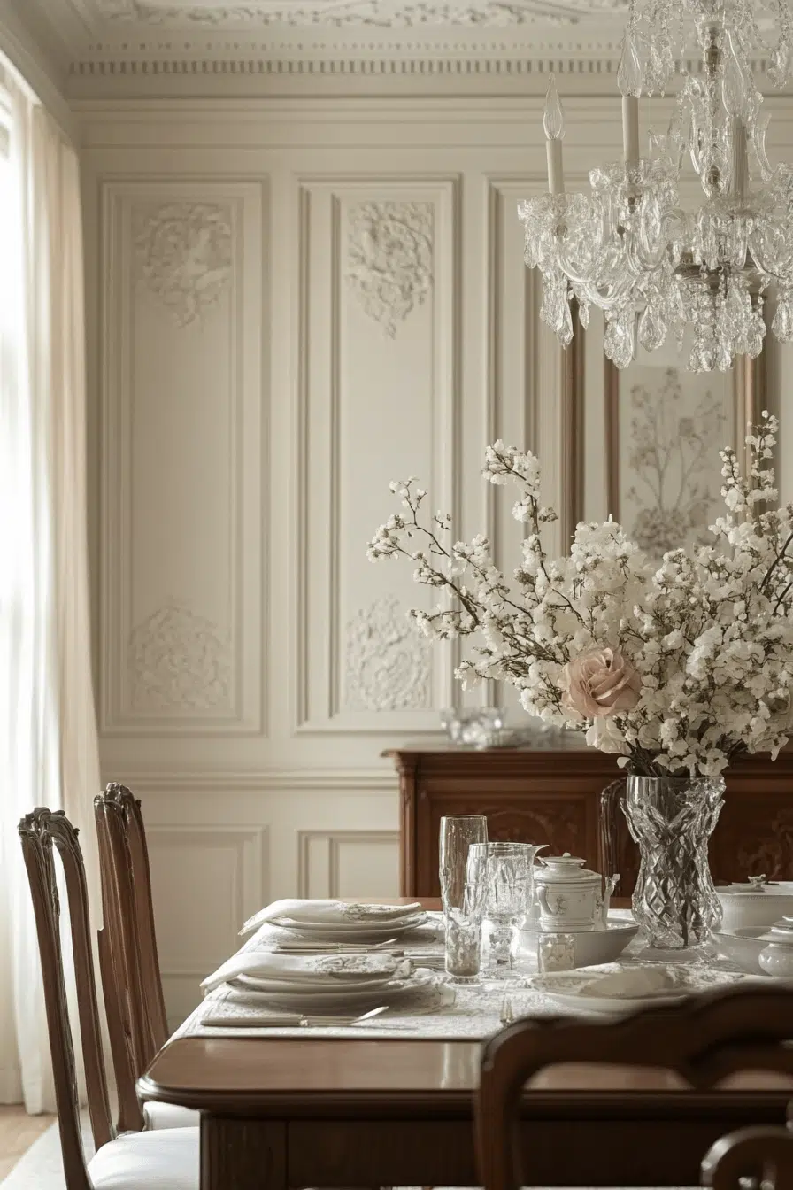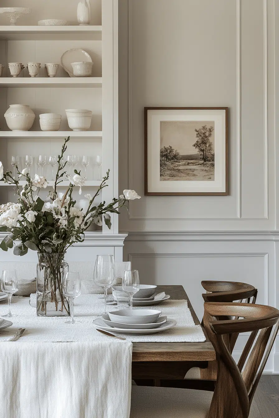Layered wall paneling defines architectural rhythm in a neoclassical dining room, adding dimension and order. Painted in tonal neutrals, it enhances height and symmetry. Framed artwork aligns beautifully within the panels. A classic chandelier centers the arrangement. The look feels tailored and timeless. Tap to elevate your neoclassical dining room with structured panel elegance!