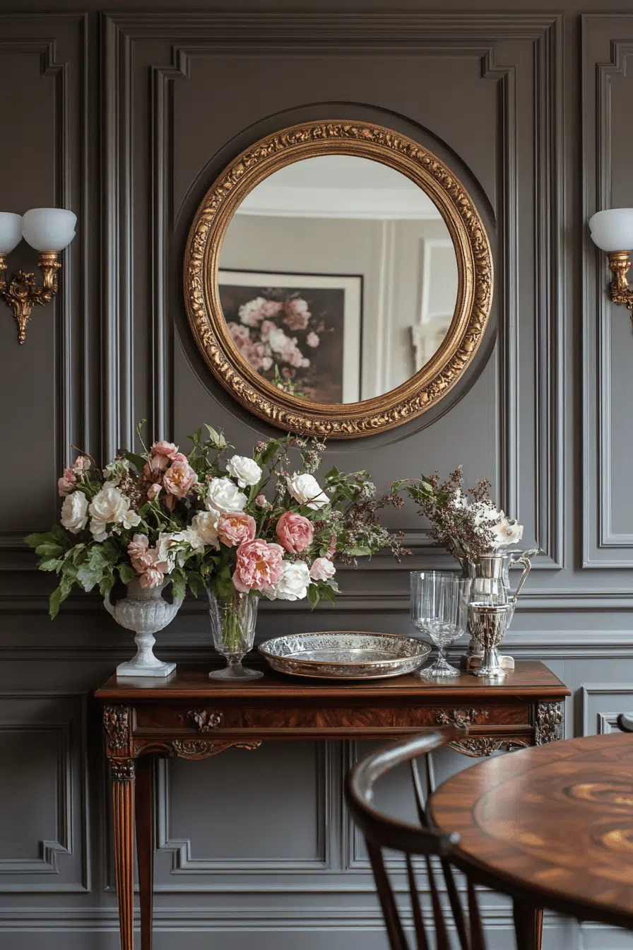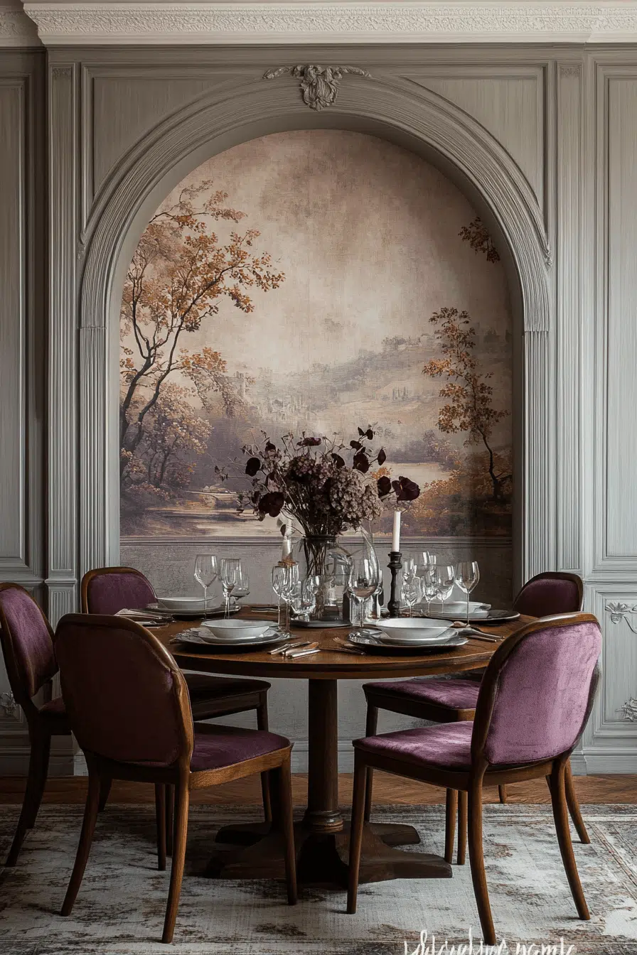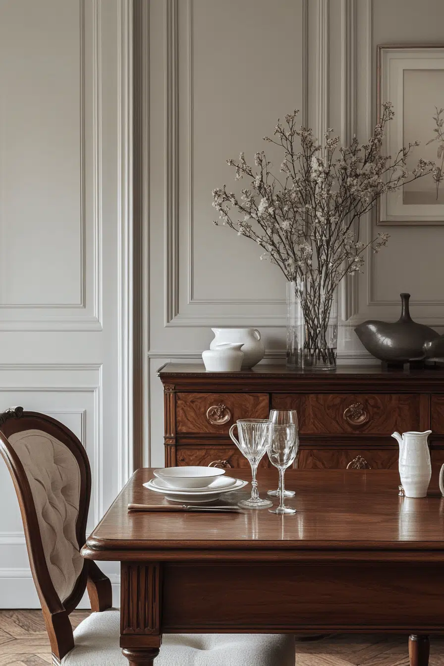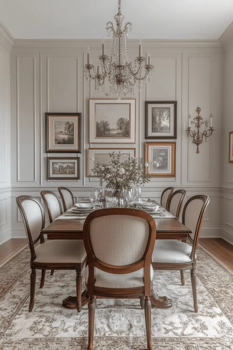 A symmetrical art arrangement within paneled walls brings curated personality to a neoclassical dining room. Muted frames align beautifully with architectural trim. The display adds depth and narrative. Balanced placement maintains classical order. The effect feels polished and intentional. Tap to personalize your neoclassical dining room with refined artistry!