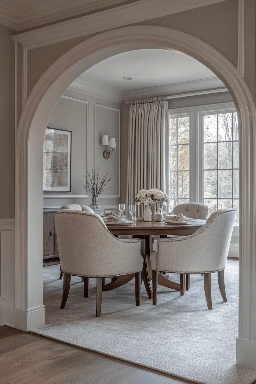 Rounded archways soften transitions within a neoclassical dining room, enhancing flow between spaces. Curves contrast elegantly with linear paneling. Tall baseboards and layered lighting reinforce sophistication. The space feels romantic yet grounded. Architectural continuity remains intact. Click to embrace graceful arches in your neoclassical dining room!