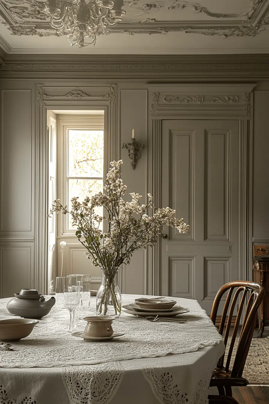 A sculpted plaster ceiling medallion adds intricate charm to a neoclassical dining room, framing overhead lighting beautifully. Paired with a chandelier, it reinforces symmetry. Pale tones highlight detail without heaviness. The ceiling becomes a subtle focal point. Heritage craftsmanship shines overhead. Click to enhance your neoclassical dining room from above!