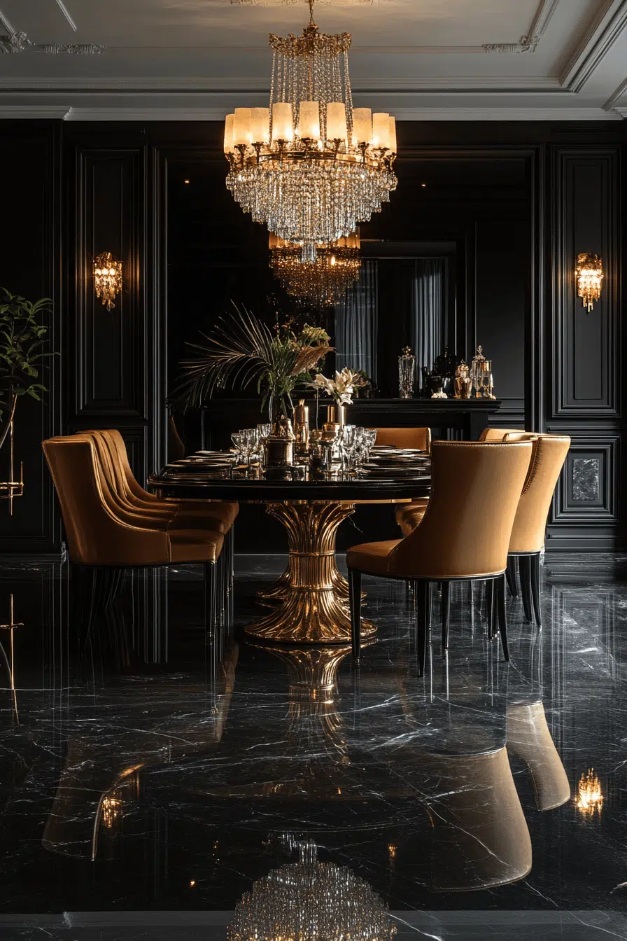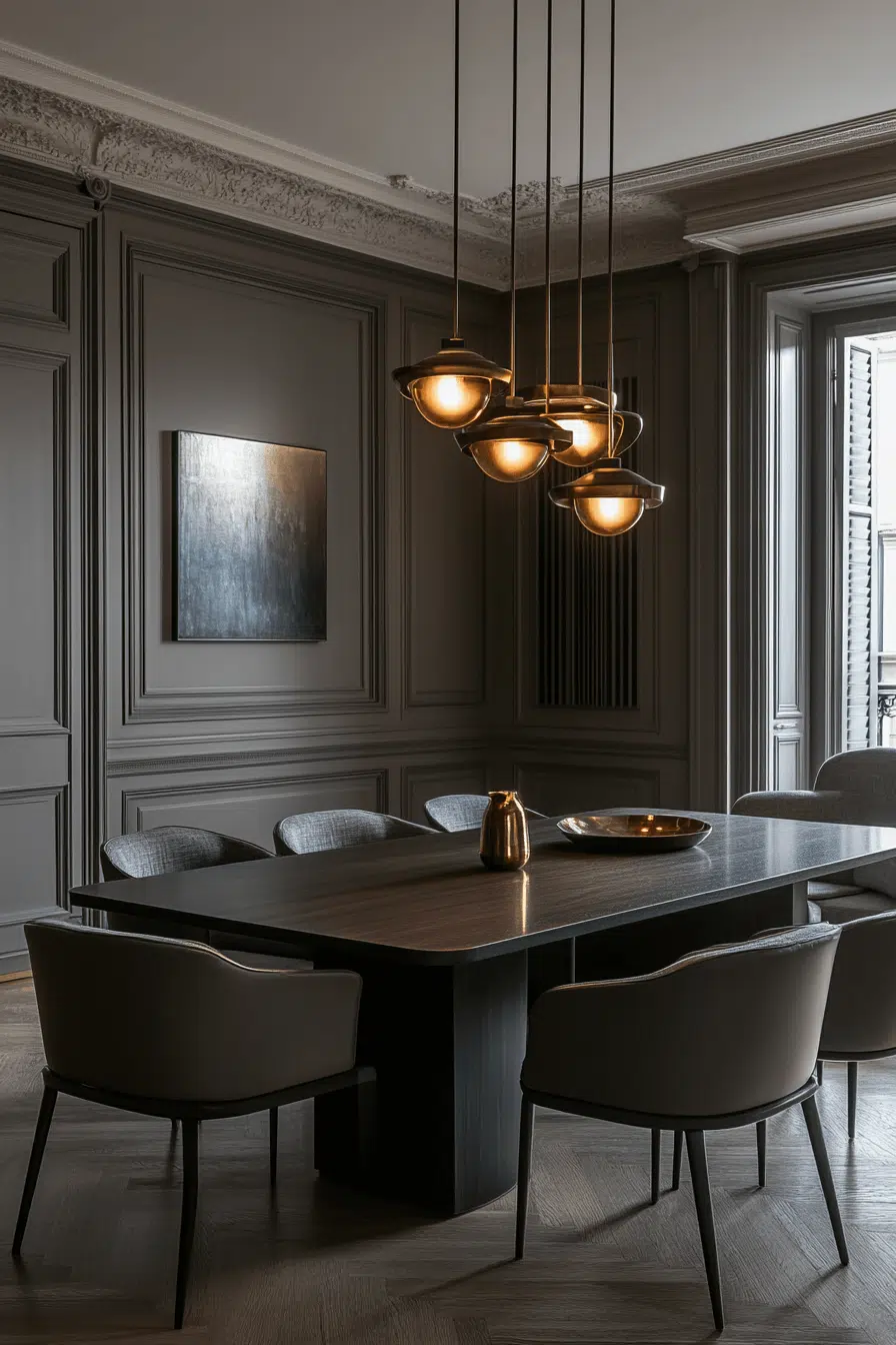 A deep charcoal and ivory pairing creates dramatic refinement in a neoclassical dining room, emphasizing architectural symmetry. Dark lower walls contrasted with lighter upper panels enhance classical proportion. A sculpted chandelier anchors the composition overhead. Clean-lined furniture keeps the palette feeling modern. The result is bold yet impeccably balanced. Tap to redefine your neoclassical dining room with striking contrast!