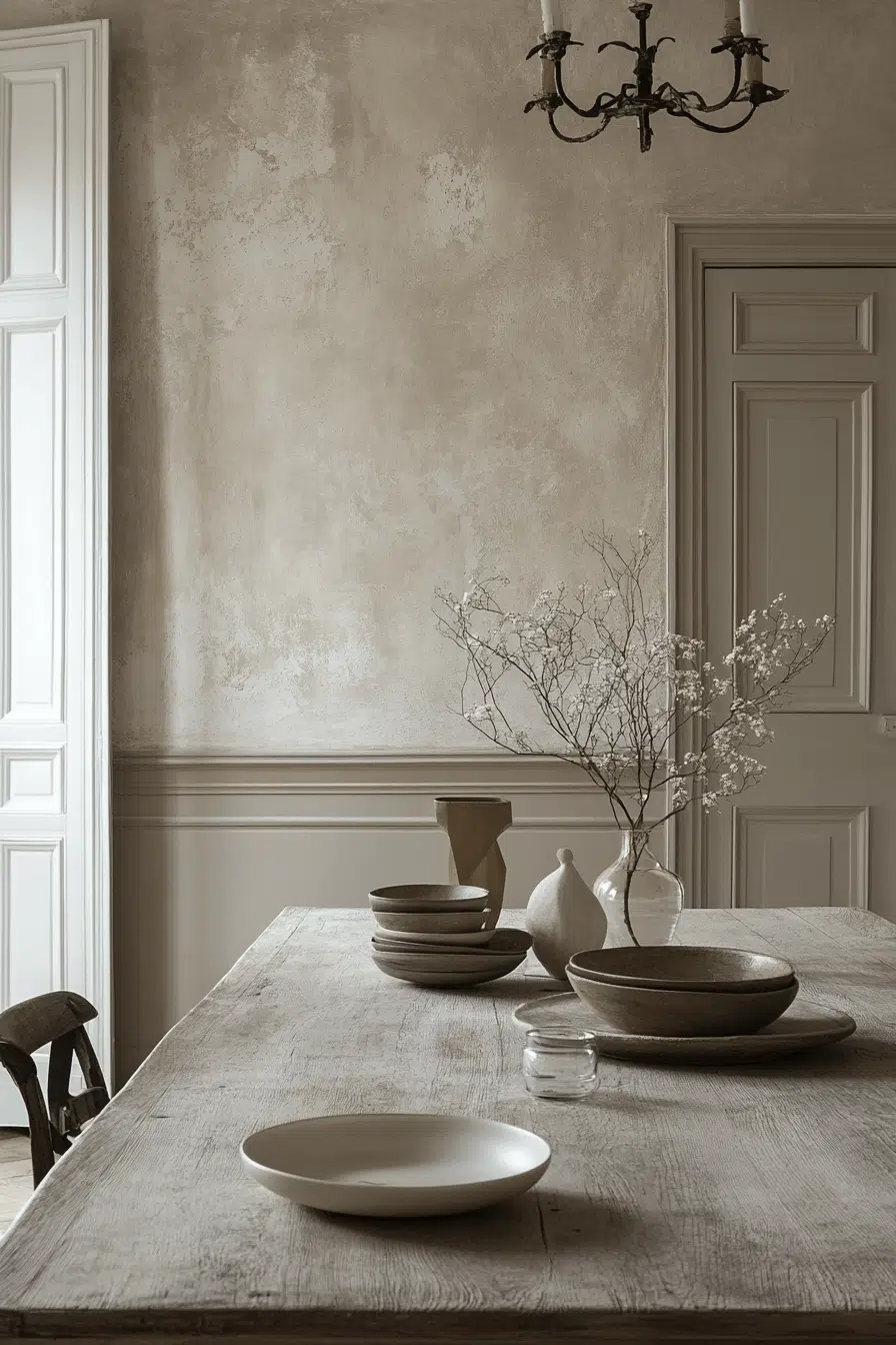 Textured limewash walls bring artisanal softness to a neoclassical dining room, contrasting crisp trim beautifully. Warm lighting enhances the tactile finish. The blend of organic texture and formal detailing feels balanced. Subtle sheen adds depth without gloss. The space feels sophisticated yet inviting. Tap to explore plastered elegance in your neoclassical dining room!