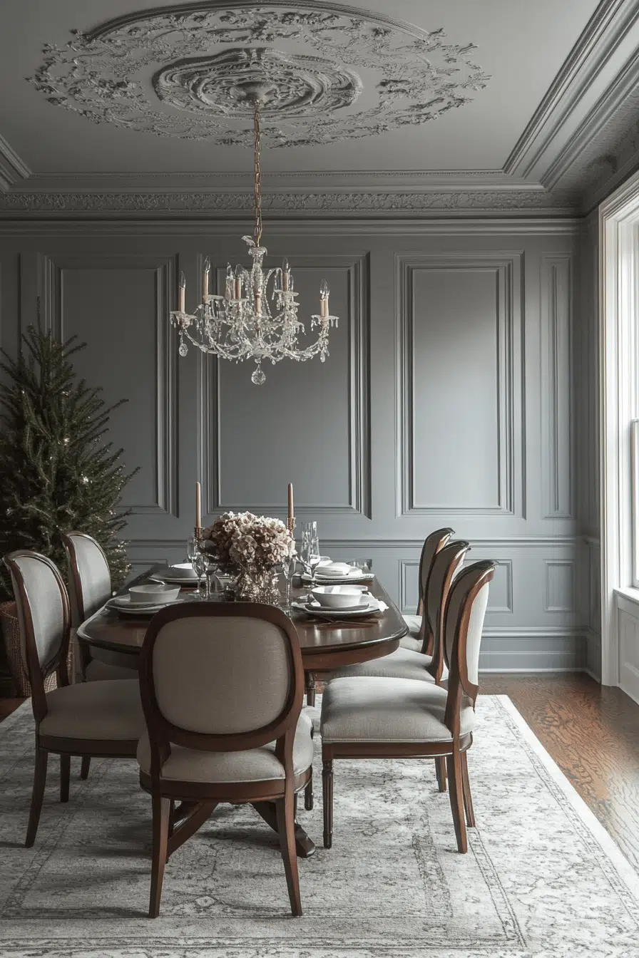 Misty blue-grey walls introduce fresh sophistication to a neoclassical dining room. Crisp white molding sharpens the contrast. A warm wood table anchors the palette. Subtle metallic accents tie everything together. The mood feels airy and balanced. Tap to infuse your neoclassical dining room with cool-toned elegance!
