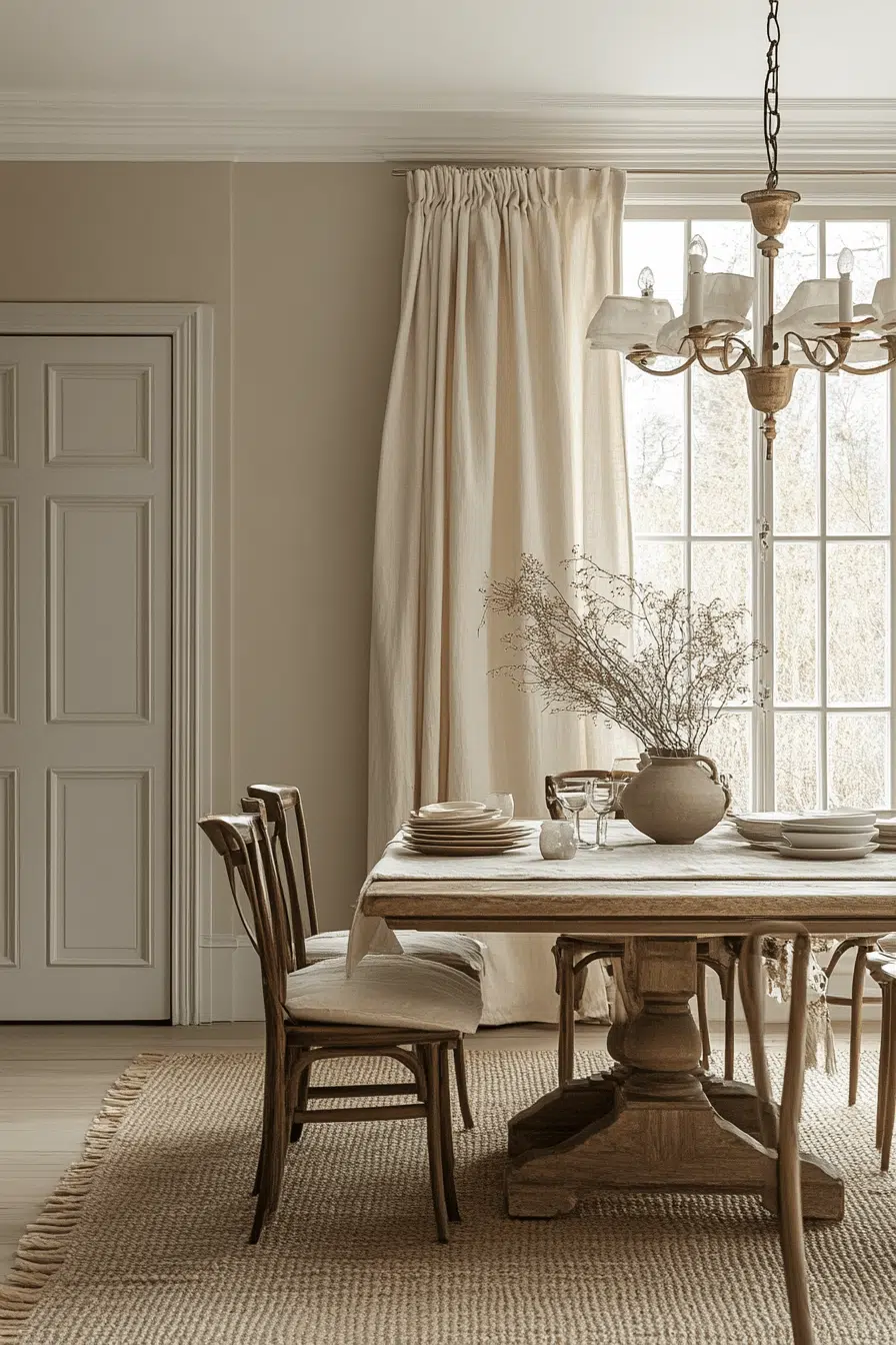 Cream and stone tones establish serene cohesion in a neoclassical dining room, letting architectural features shine. Brass fixtures add gentle contrast. A marble tabletop enhances classical elegance. Layered lighting warms the palette beautifully. The room feels calm yet stately. Click to explore refined simplicity in your neoclassical dining room!