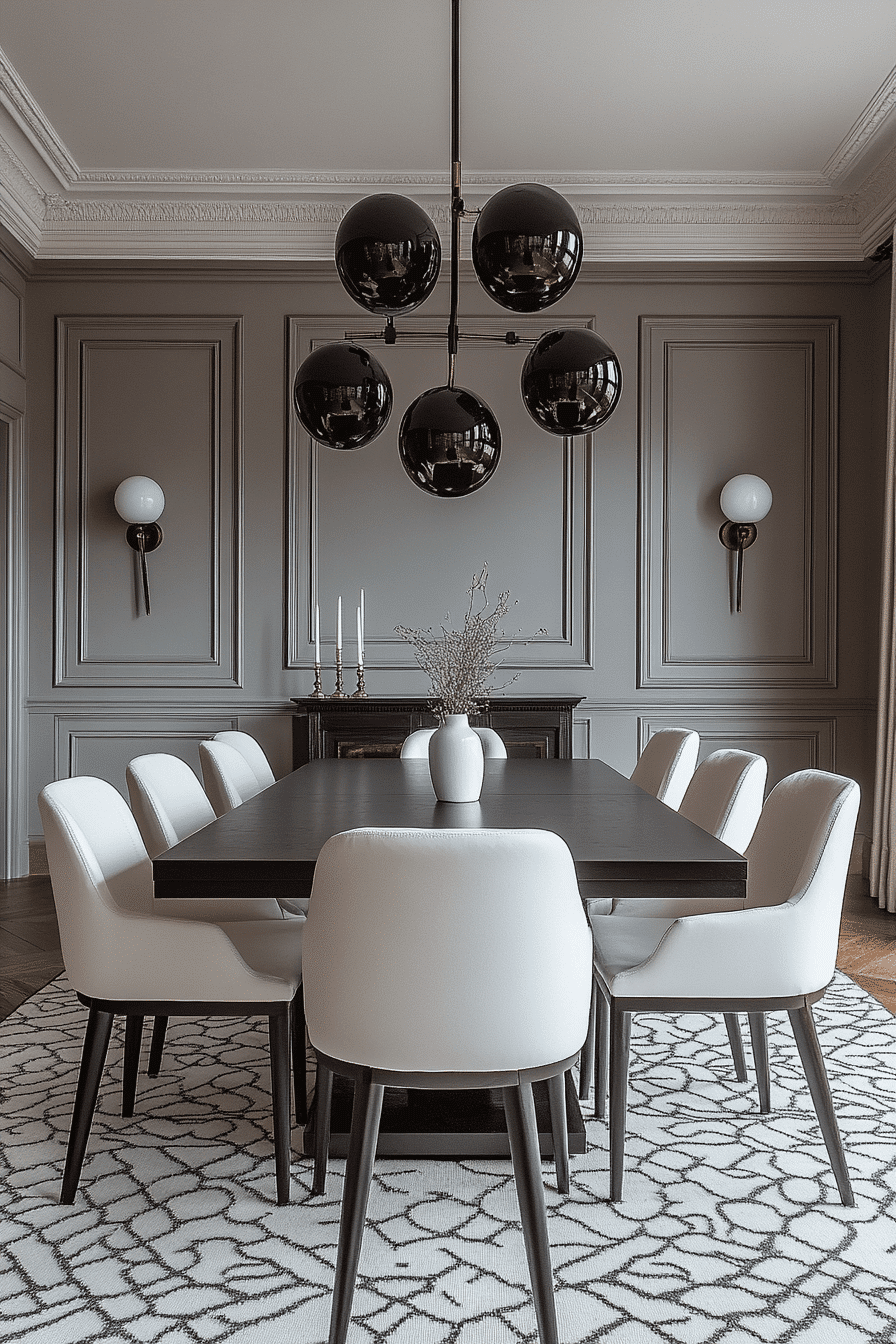 A deep charcoal and ivory pairing creates dramatic refinement in a neoclassical dining room, emphasizing architectural symmetry. Dark lower walls contrasted with lighter upper panels enhance classical proportion. A sculpted chandelier anchors the composition overhead. Clean-lined furniture keeps the palette feeling modern. The result is bold yet impeccably balanced. Tap to redefine your neoclassical dining room with striking contrast!