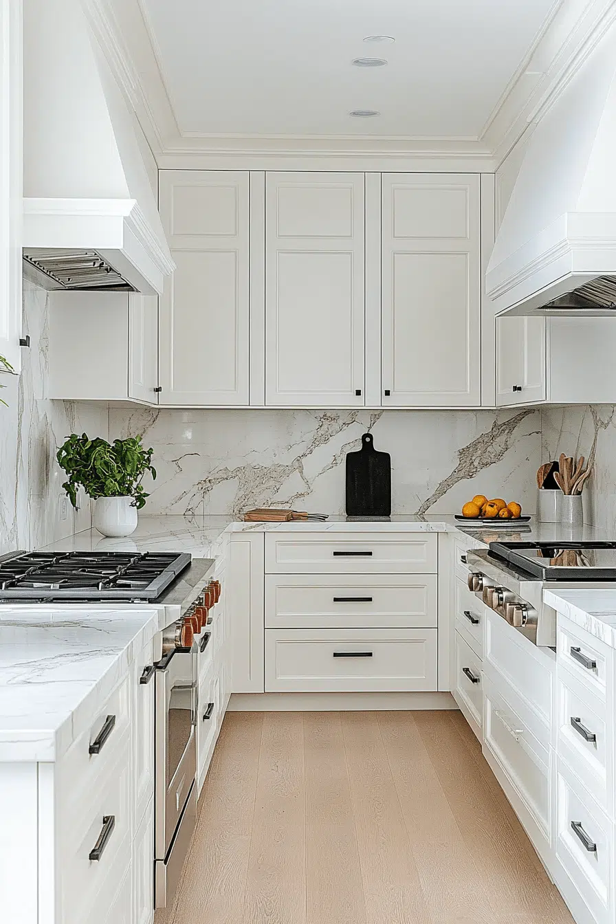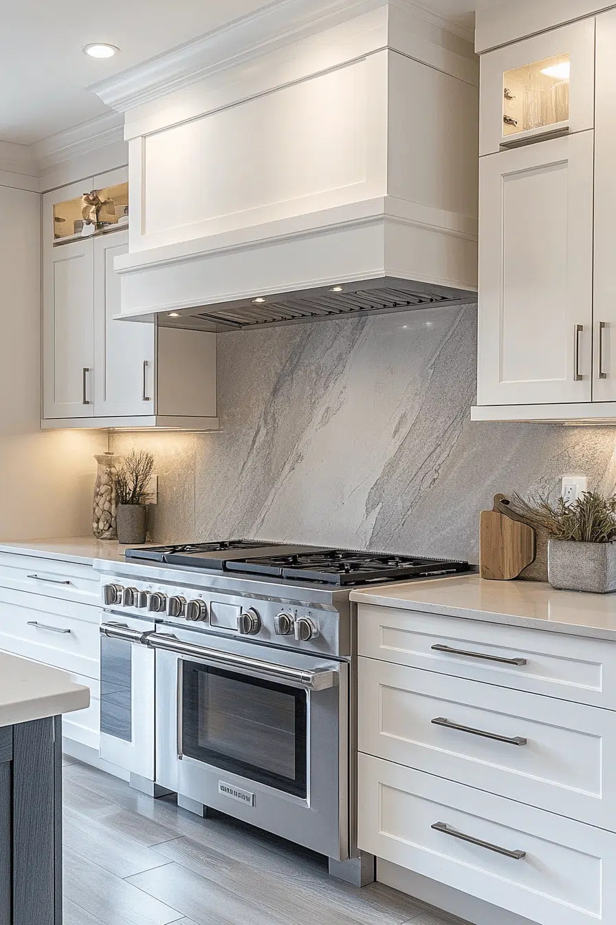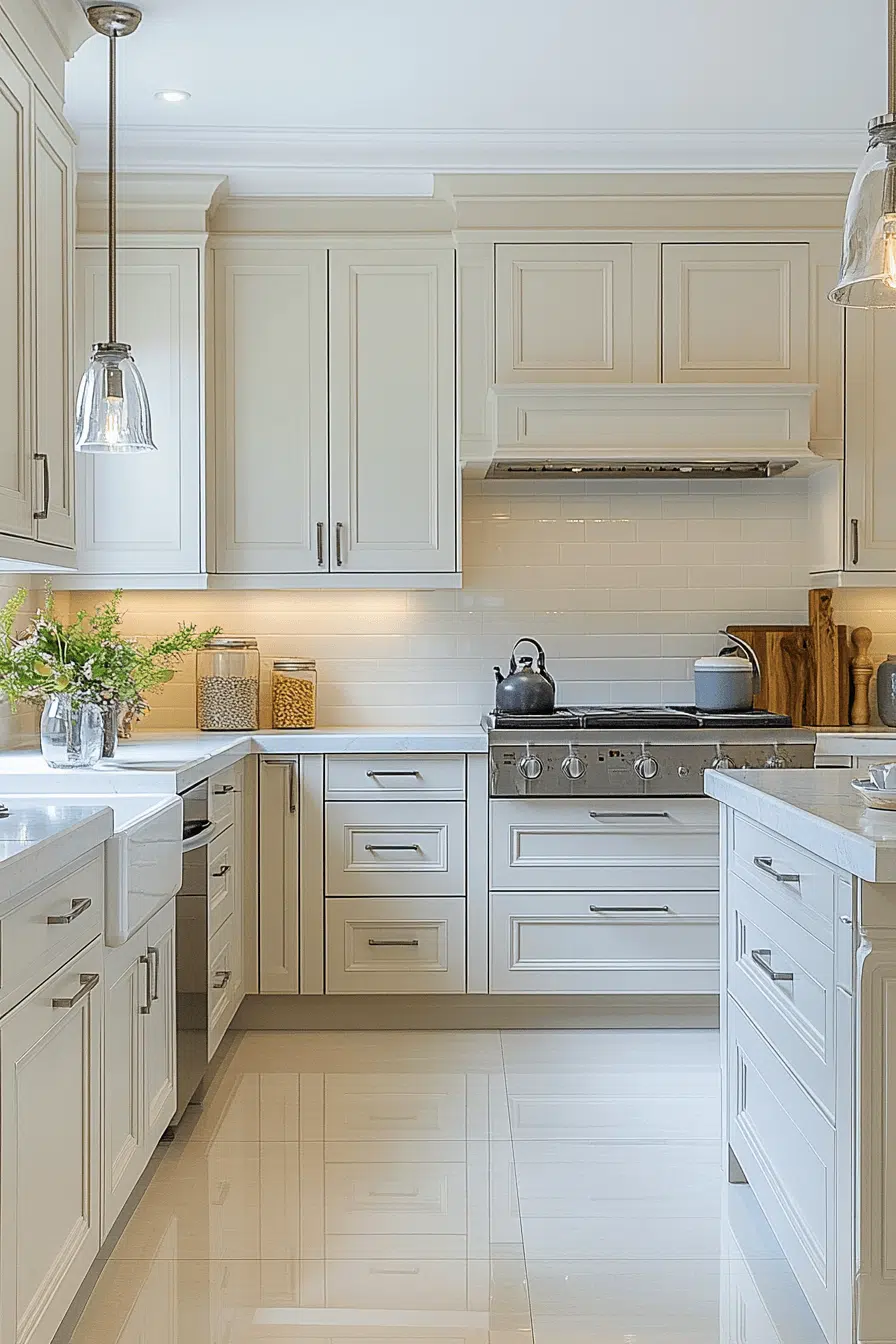A cooler sense of sophistication takes shape when off white kitchen cabinets include subtle gray undertones that feel fresh and modern. These tones complement marble surfaces, silver hardware, and sleek tile beautifully. The palette remains calm while adding a contemporary edge. Light and dark elements feel evenly balanced. The space feels refined and current. Explore off white kitchen cabinets with cool, modern depth.