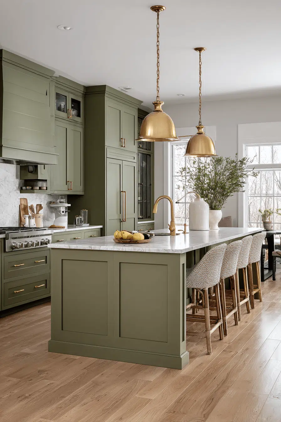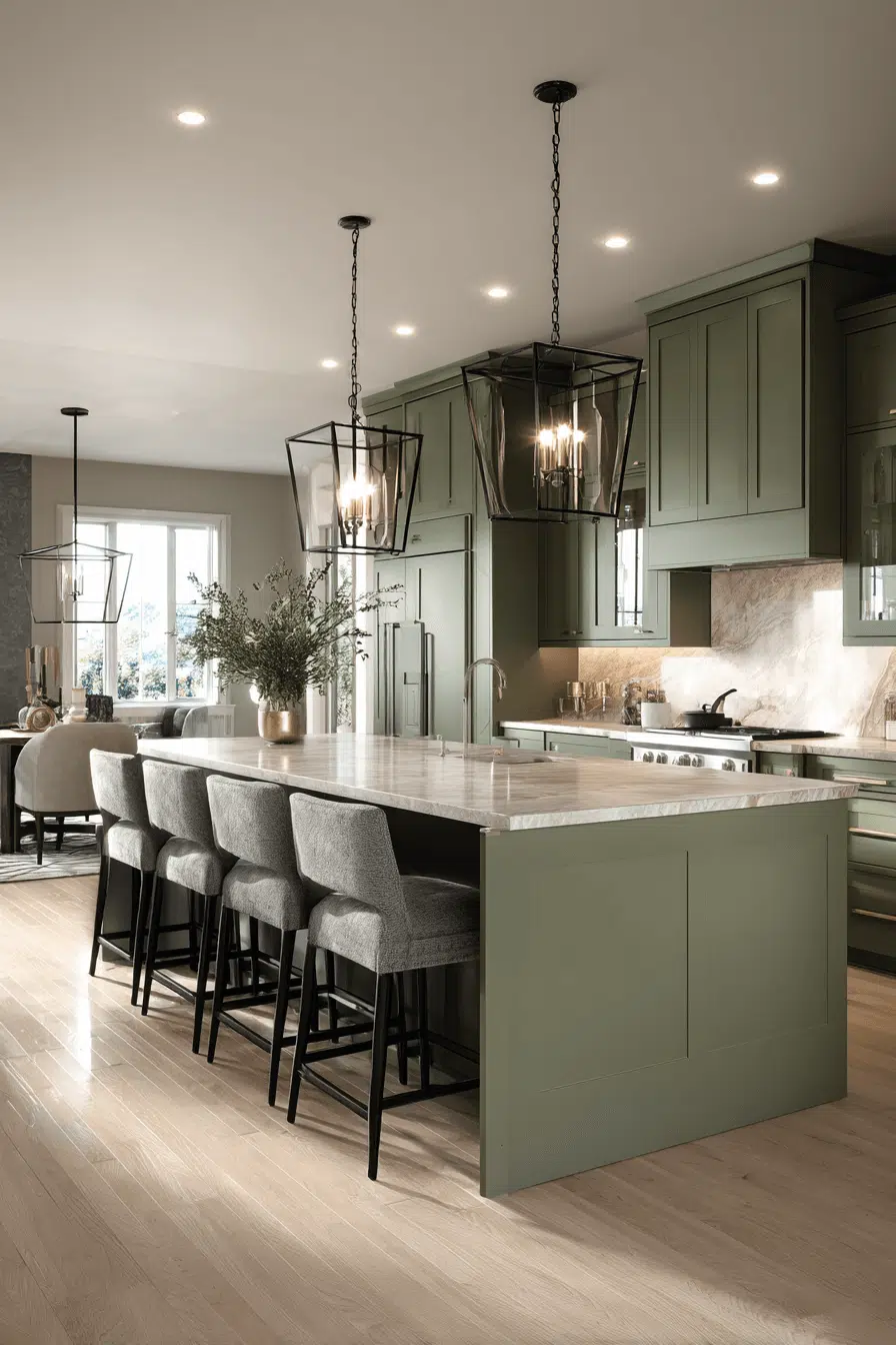 Pendant lighting layered over an olive green kitchen island creates a dramatic yet inviting focal point. The green cabinetry anchors the space while lighting adds dimension. Crisp countertops provide balance and brightness. The layered design feels intentional and curated. Olive naturally draws the eye when centered on the island. Make your island stand out with olive confidence now.