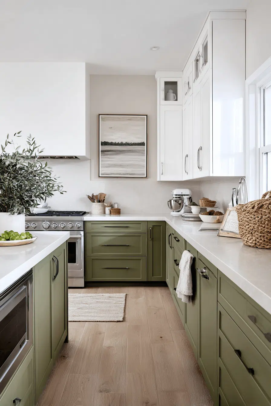 Two-tone cabinetry featuring olive lowers and lighter uppers brings dimension to an olive green kitchen. The contrast keeps the space feeling airy while maintaining depth. Olive anchors the design beautifully. Minimal hardware maintains cohesion. The layout feels dynamic without clutter. Try this balanced two-tone olive look now.