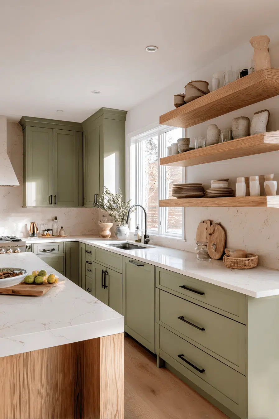 15. Olive Kitchen with Floating Shelves