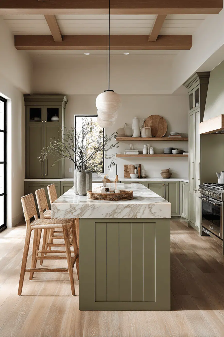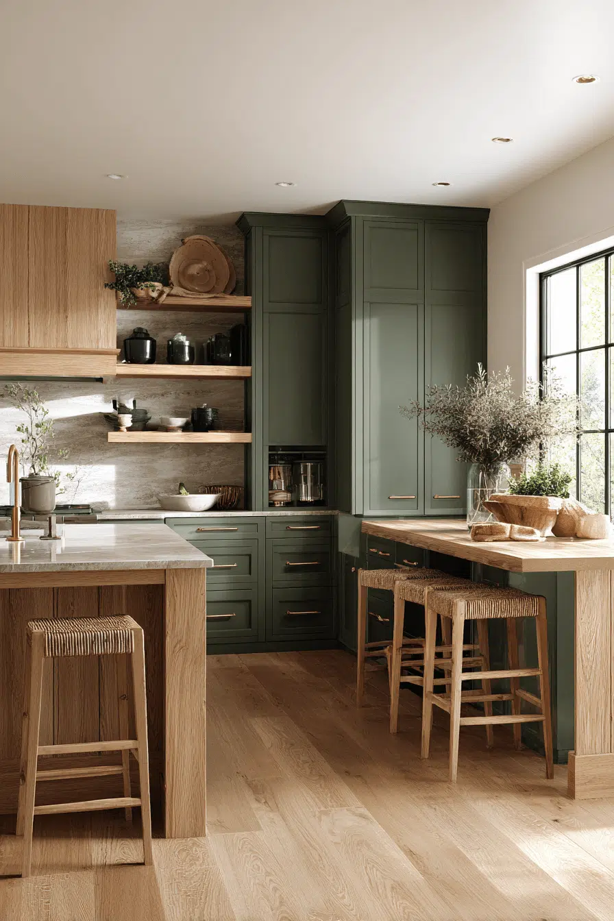 7. Olive Kitchen with Warm Wood Accents