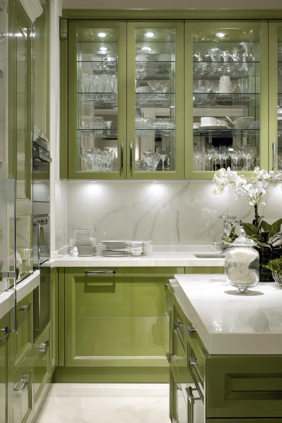 19. Olive Kitchen with Glass Cabinet Doors