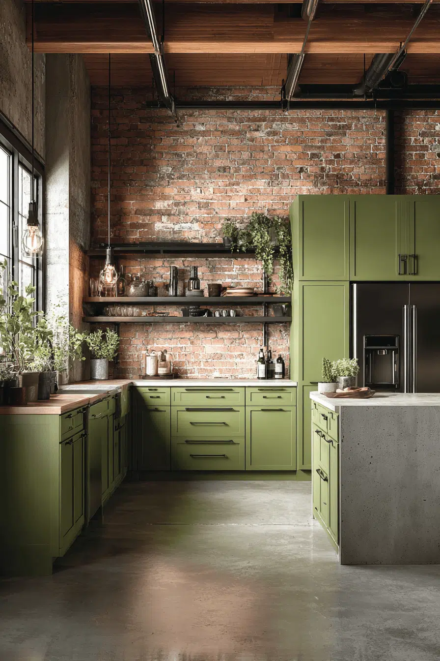 Industrial textures gain warmth in an olive green kitchen setting. Concrete counters and metal fixtures feel softer against the earthy tone. Olive adds character without harshness. Clean styling keeps the balance intact. The aesthetic feels urban yet welcoming. Explore this industrial olive vibe now.