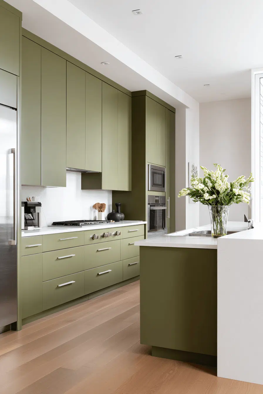 Integrated appliances maintain a seamless look in an olive green kitchen. Hidden storage keeps the focus on color and texture. Olive brings warmth to contemporary layouts. Clean surfaces enhance the streamlined aesthetic. The space feels refined and intentional. Embrace this sleek olive design in your kitchen today.