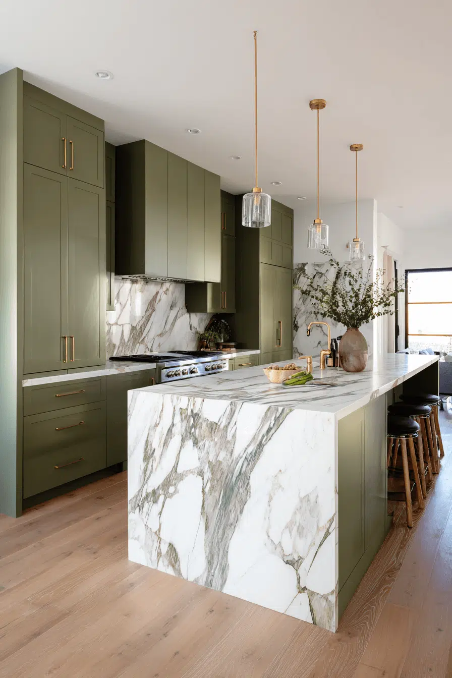 A waterfall island paired with olive cabinetry creates architectural elegance in an olive green kitchen. Seamless stone edges add drama and refinement. Olive enhances the natural beauty of the stone. Minimal seating keeps the focus on design. The look feels modern and luxurious. Elevate your olive kitchen with this bold feature today.