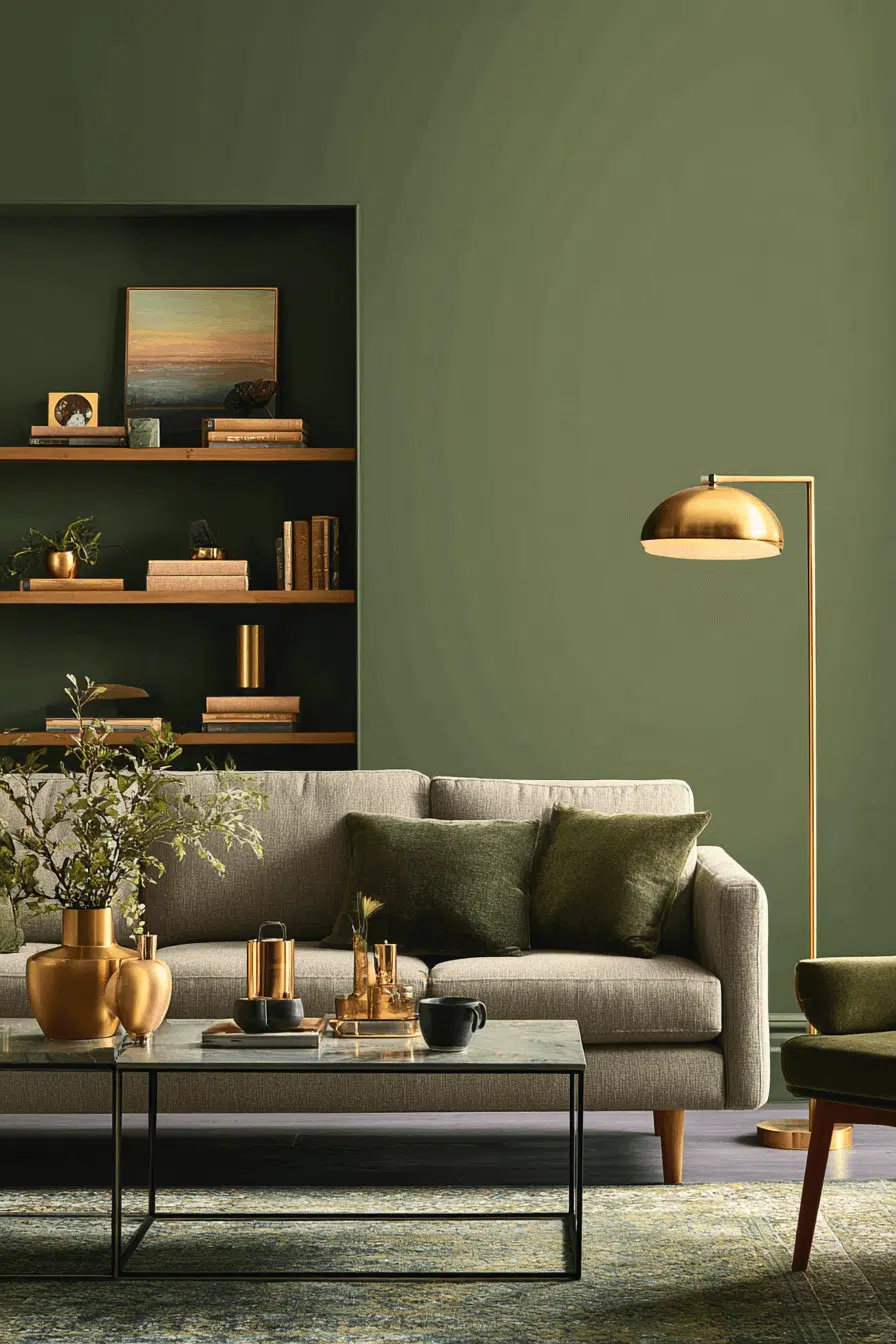 Brass accents introduce subtle glow and refinement. In an olive green living room, metallic touches catch the light beautifully. The warmth of brass complements olive’s earthy undertones. Balanced styling keeps the space cohesive and elegant. This pairing thrives because olive grounds metallic shine gracefully. Click to elevate your space with luminous details.