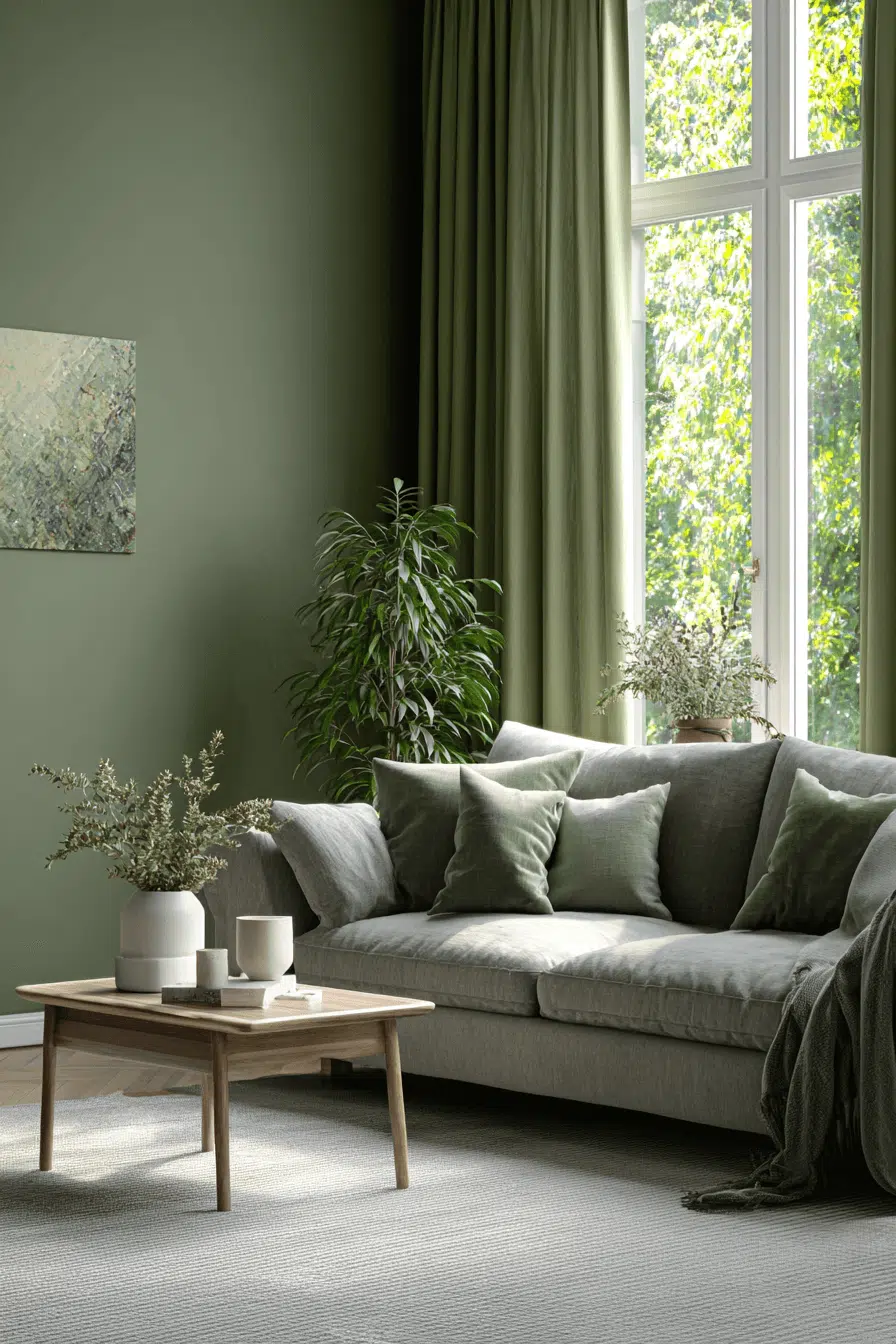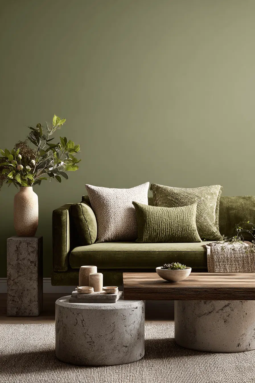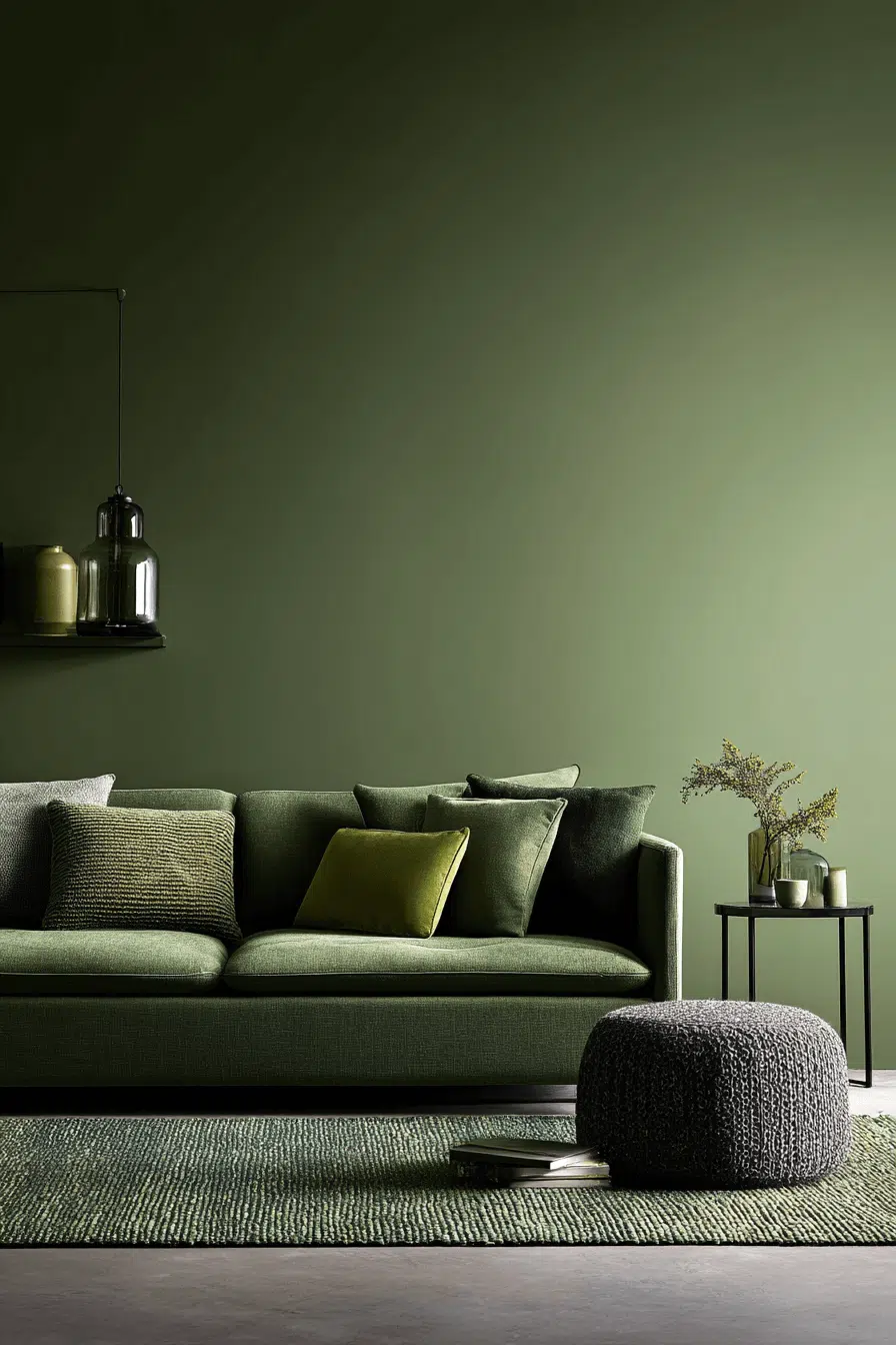 Using two complementary tones creates subtle contrast. In an olive green living room, layering lighter greens prevents heaviness. The palette feels dynamic yet unified. Minimal décor ensures balance. This approach works because olive anchors multi-tone styling gracefully. Tap to experiment with layered greens.
