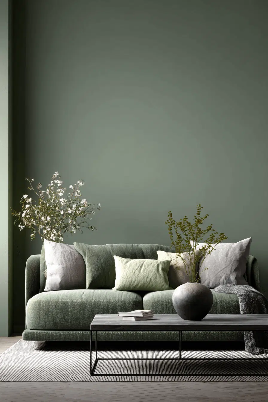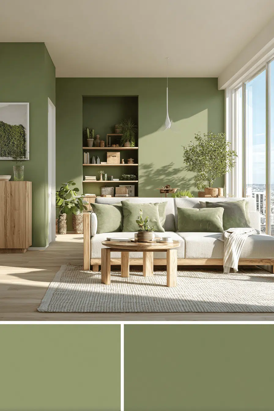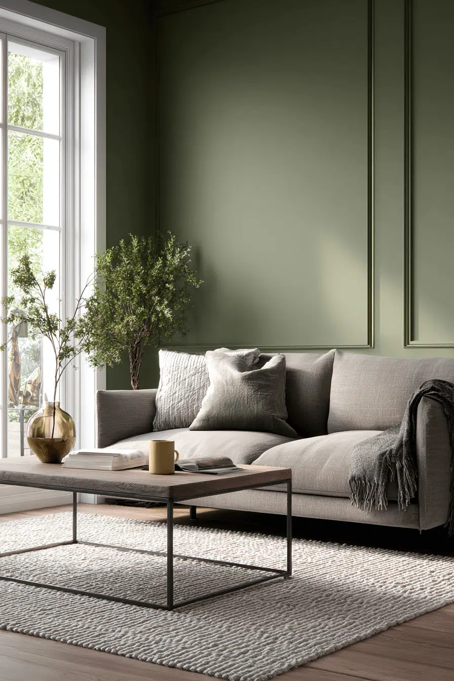 Using two complementary tones creates subtle contrast. In an olive green living room, layering lighter greens prevents heaviness. The palette feels dynamic yet unified. Minimal décor ensures balance. This approach works because olive anchors multi-tone styling gracefully. Tap to experiment with layered greens.