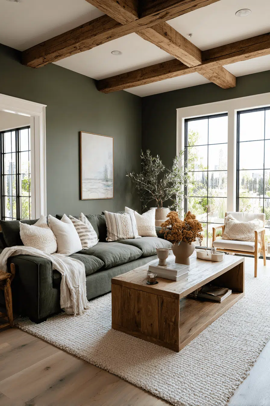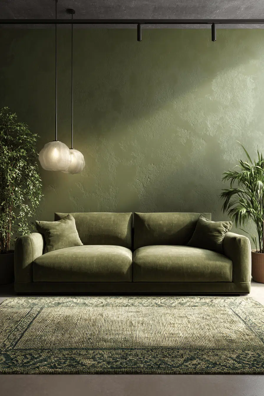 A textured rug instantly softens and grounds the design. An olive green living room paired with natural fiber rugs feels warm and inviting. The contrast between rich color and tactile flooring enhances comfort. Olive pairs seamlessly with organic materials underfoot. This styling works because texture balances depth. Click to elevate your foundation beautifully.
