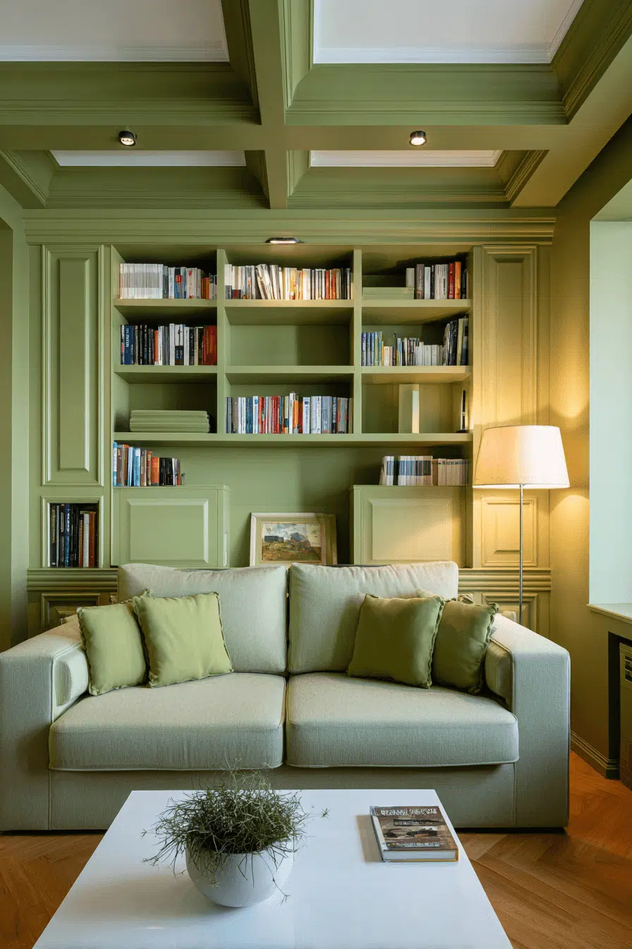 Built-in shelving painted olive adds architectural presence. An olive green living room with coordinated shelves feels cohesive and intentional. Books and ceramics pop against the rich tone. The feature adds dimension without clutter. This design thrives because olive unifies design elements seamlessly. Tap to elevate your living room with custom details.