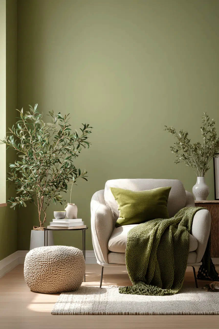 Creating a cozy corner in olive feels intimate and thoughtful. In an olive green living room, soft seating and warm lighting encourage relaxation. The tone provides a soothing backdrop. Layered textiles enhance comfort without overwhelming the space. This works because olive feels calm yet expressive. Explore how to design your perfect retreat.