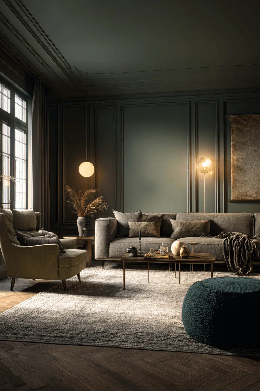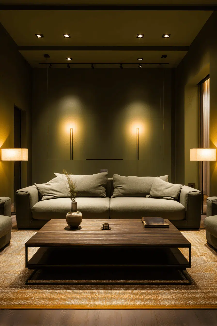 Warm lighting enhances olive’s richness instantly. An olive green living room illuminated with golden bulbs feels welcoming and intimate. The glow deepens the hue beautifully. Sleek fixtures keep the aesthetic modern. This works because olive reflects warm light effortlessly. Discover how lighting transforms your space.