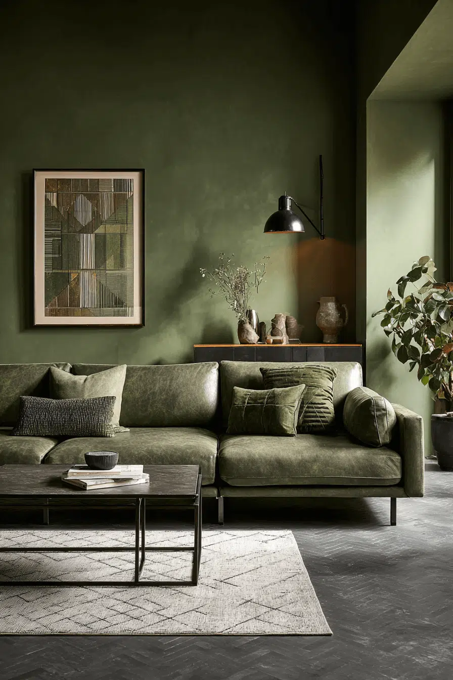 Urban styling feels warmer when olive enters the palette. An olive green living room paired with metal finishes and sleek silhouettes feels refined yet approachable. The green softens industrial edges gracefully. Clean styling maintains cohesion. This look thrives because olive introduces warmth to city-inspired design. Tap to bring urban sophistication home.