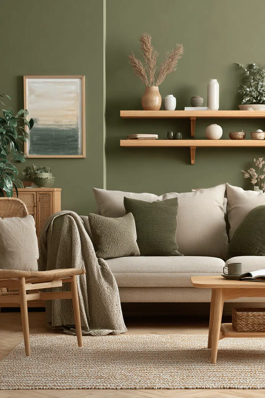 Natural wood finishes complement olive beautifully. In an olive green living room, oak or walnut accents bring warmth and organic harmony. The earthy undertones blend seamlessly. Woven textures and natural rugs amplify the grounded vibe. This pairing succeeds because olive enhances natural materials effortlessly. Tap to bring earthy balance into your living space.