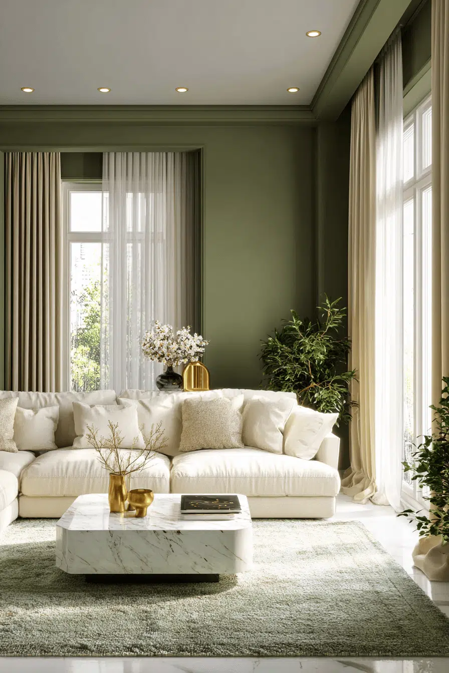 Marble elements brighten olive effortlessly. In an olive green living room, stone surfaces add polish and movement. The veining contrasts gracefully with solid green tones. The pairing feels refined yet fresh. This design succeeds because olive adds depth while marble introduces lightness. Tap to blend green and stone seamlessly.