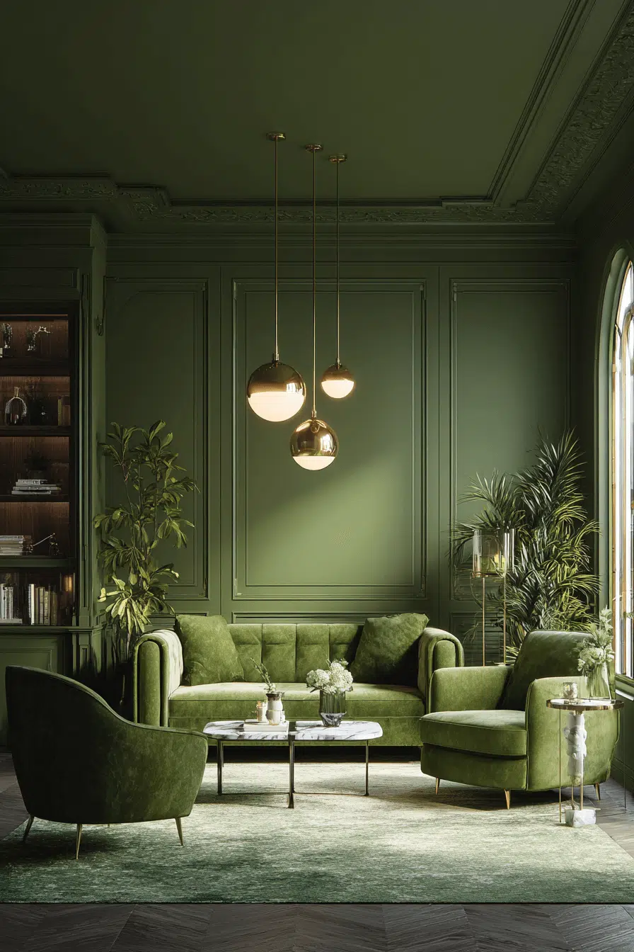 Luxurious textures elevate olive to a refined level instantly. An olive green living room layered with velvet seating and polished finishes feels rich and curated. The color itself carries sophistication without overwhelming delicate details. Soft lighting enhances depth and dimension. This approach works because olive naturally feels upscale and composed. Explore how to create your own elevated green lounge.