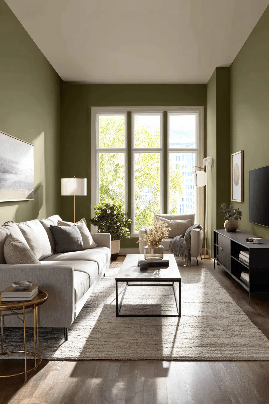 Earthy neutrals soften olive into a calming palette. An olive green living room styled with warm gray or sandy tones feels grounded and serene. Soft lighting enhances warmth further. The balance feels contemporary yet cozy. This approach works because olive harmonizes with natural hues beautifully. Discover how neutral tones enhance green spaces.
