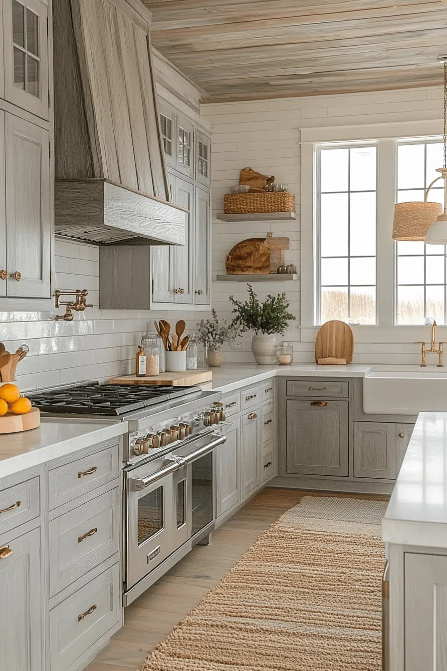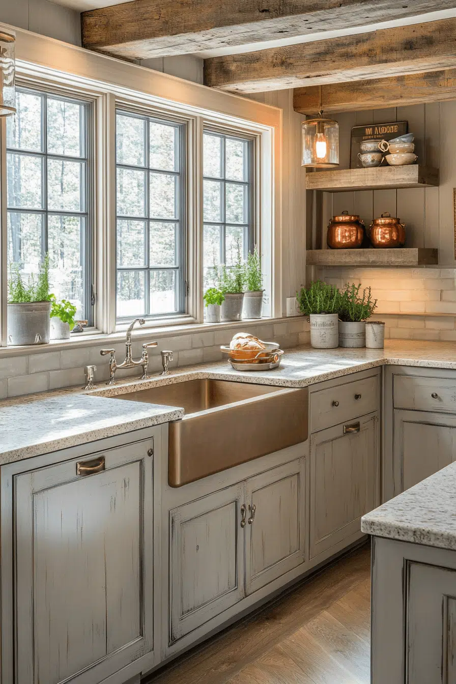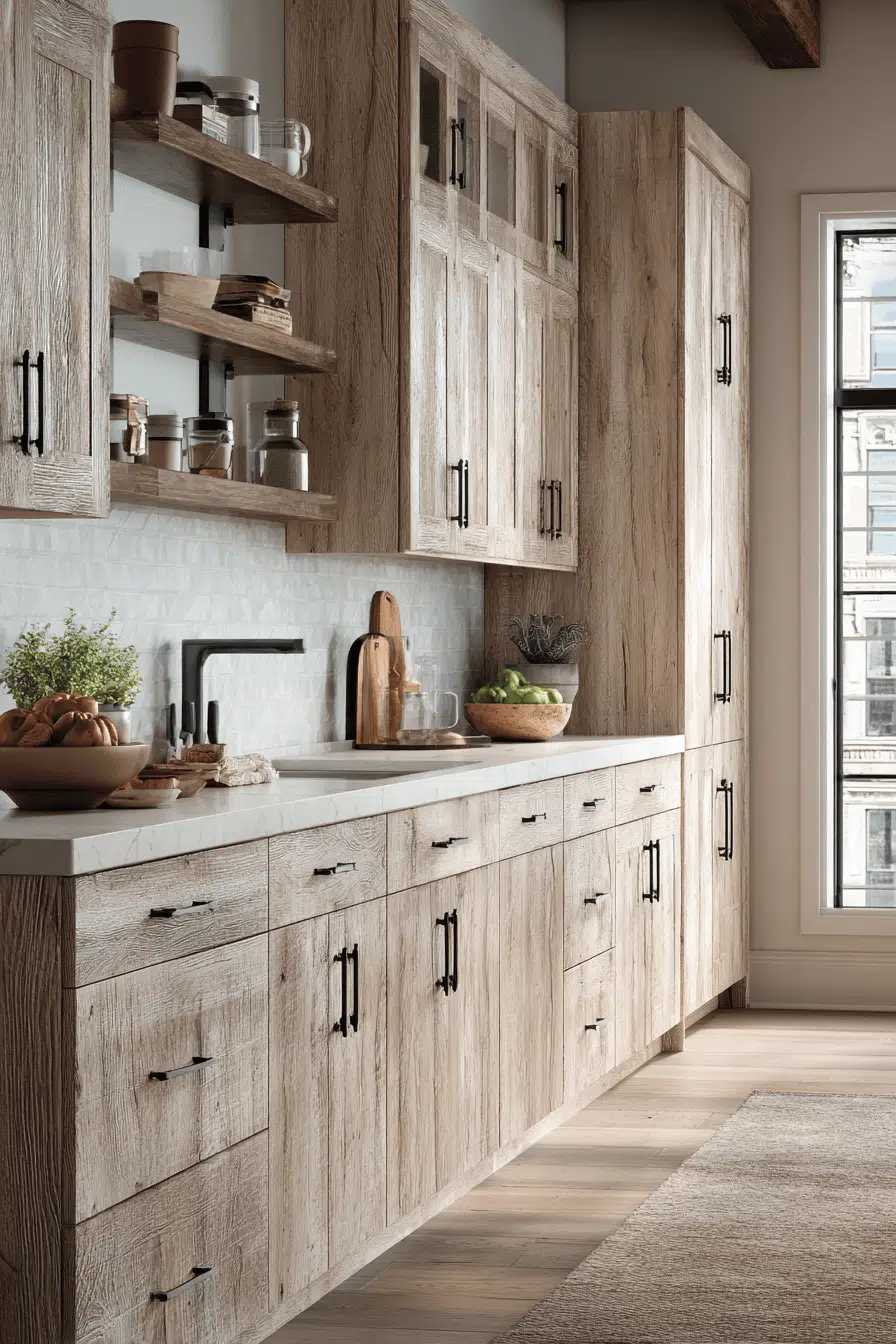 Soft gray tones inspired by driftwood give rustic kitchen cabinets a calm, coastal feel. The weathered finish blends relaxed charm with natural elegance. These cabinets pair beautifully with light stone counters and organic textures. The result feels breezy yet grounded, perfect for modern rustic living. This style works year-round and never feels heavy. Explore driftwood-inspired designs and get inspired!