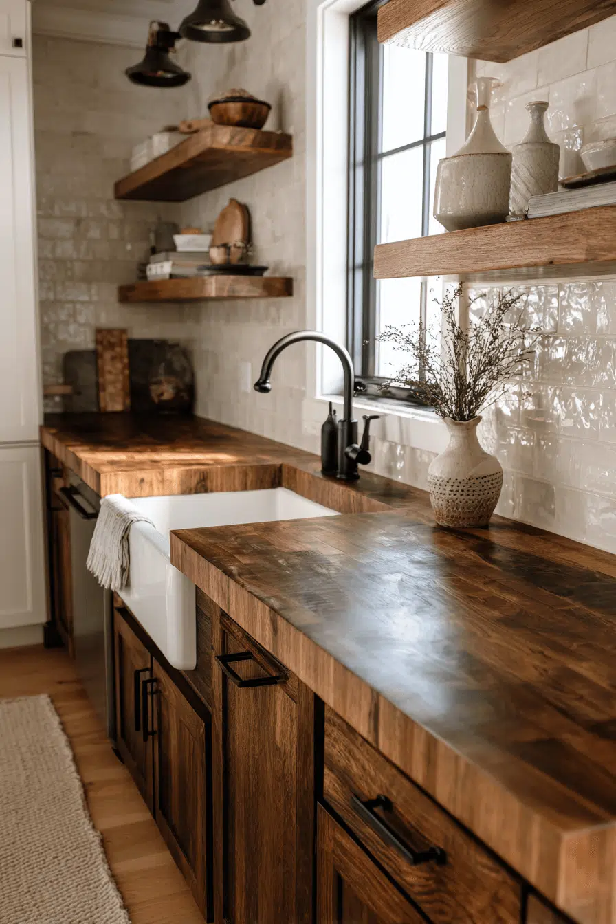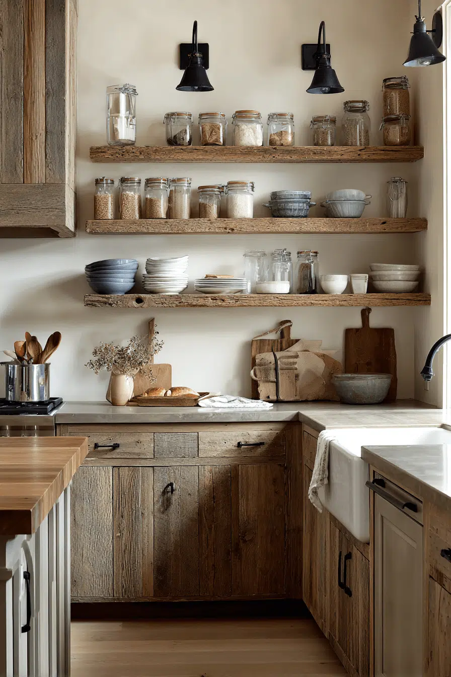 Open shelving softens the look of rustic kitchen cabinets while keeping warmth front and center. It creates space for displaying ceramics, glassware, and everyday favorites. The combination adds visual flow and breaks up heavy upper cabinetry. Natural wood shelves enhance texture and charm. This balance keeps kitchens functional yet inviting. Discover stylish ways to pair open shelves with rustic cabinets!