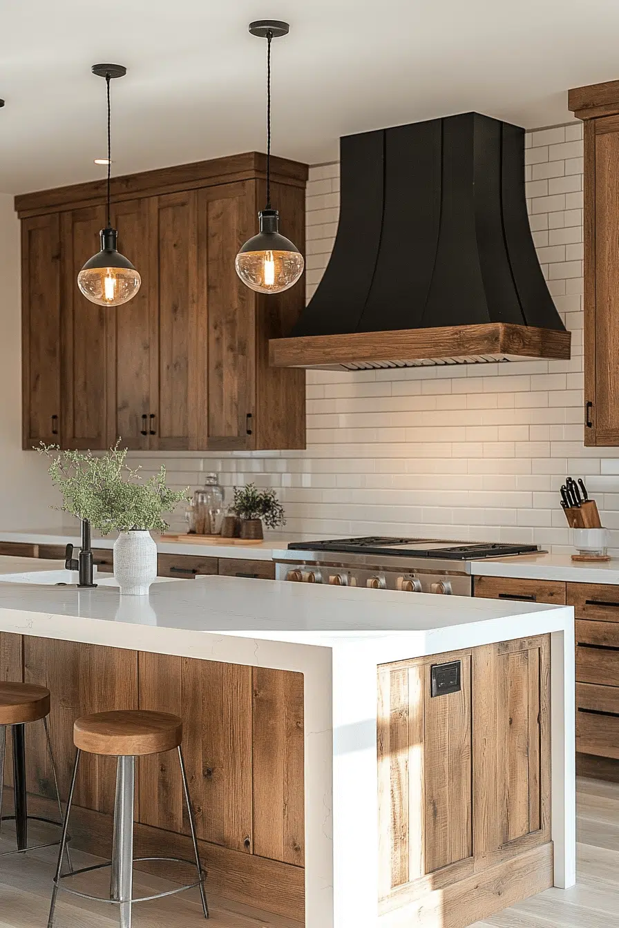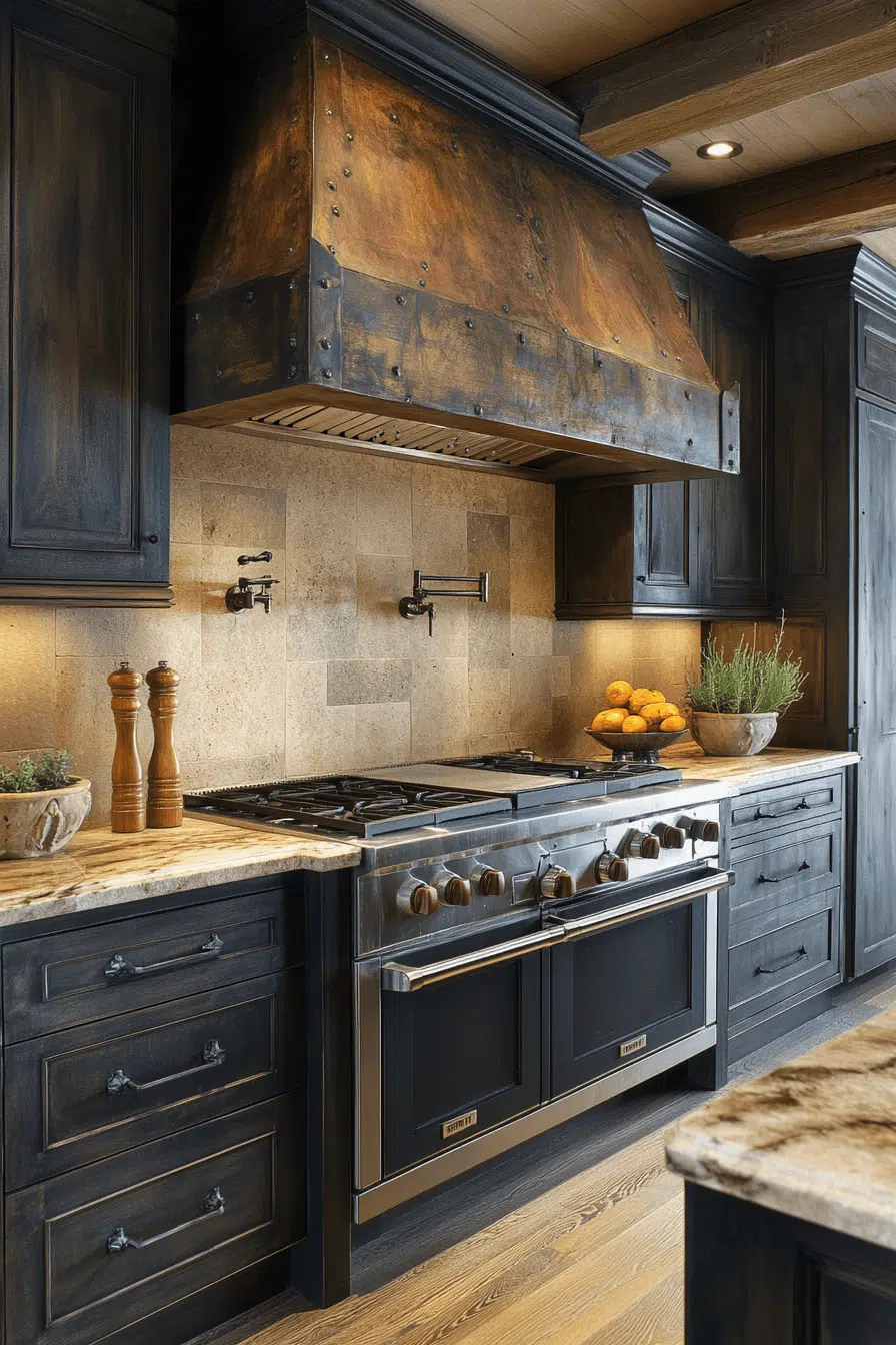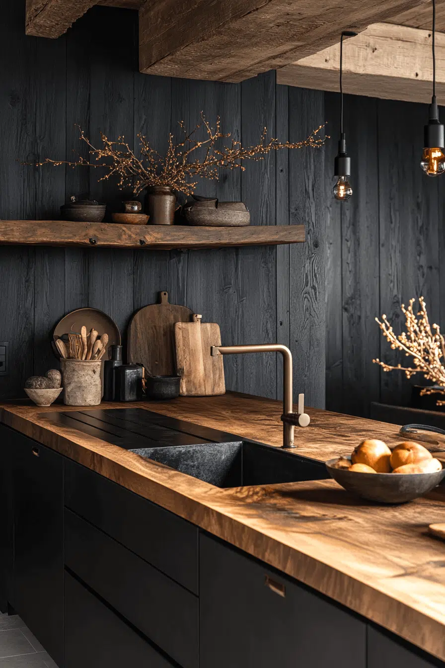 Charred wood finishes bring bold drama to rustic kitchen cabinets with rich, smoky depth. The textured surface adds visual intrigue and strength. This technique highlights natural grain while increasing durability. Paired with lighter surfaces, the contrast feels striking and intentional. The result is fearless yet refined. Explore this bold rustic style and see more ideas!