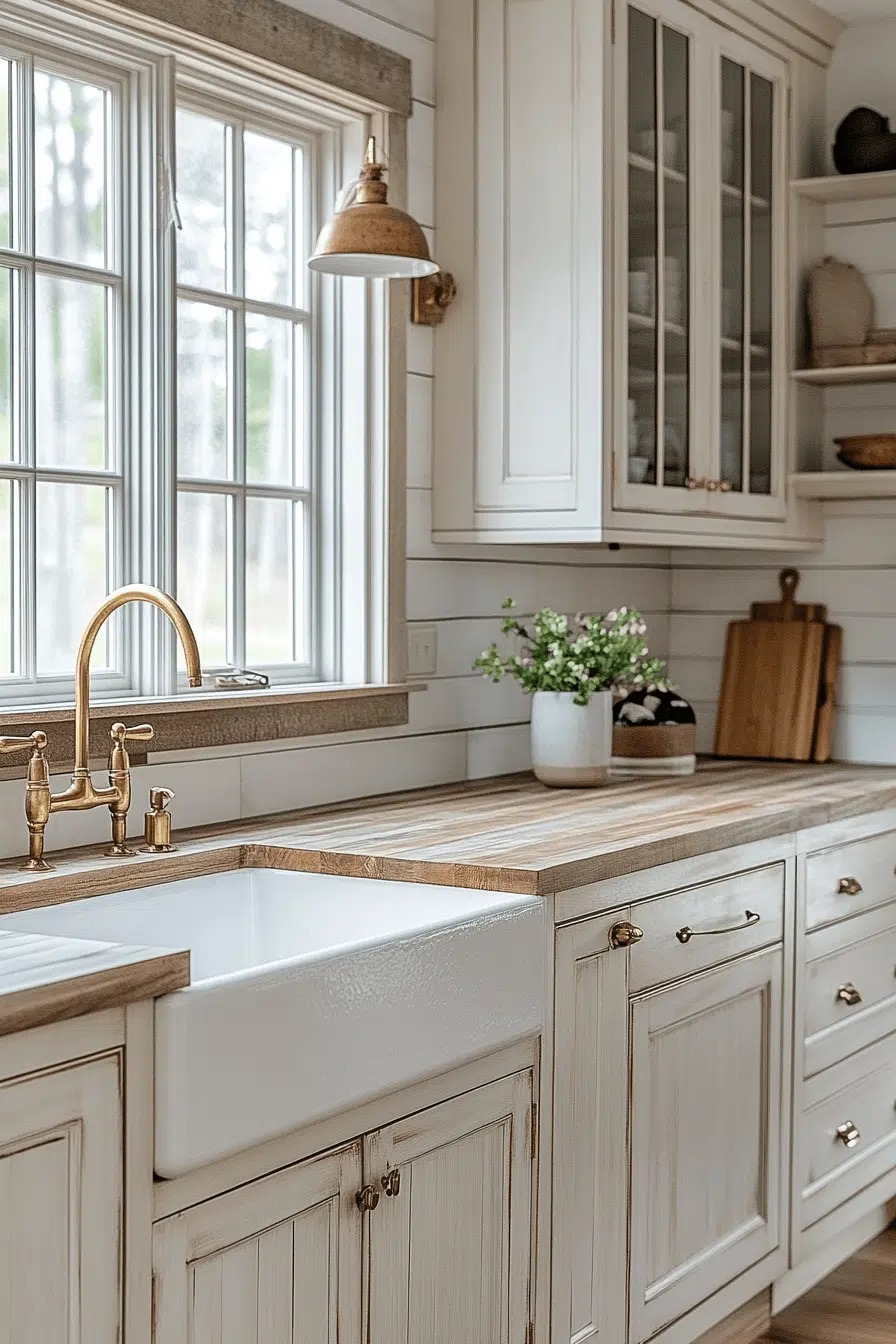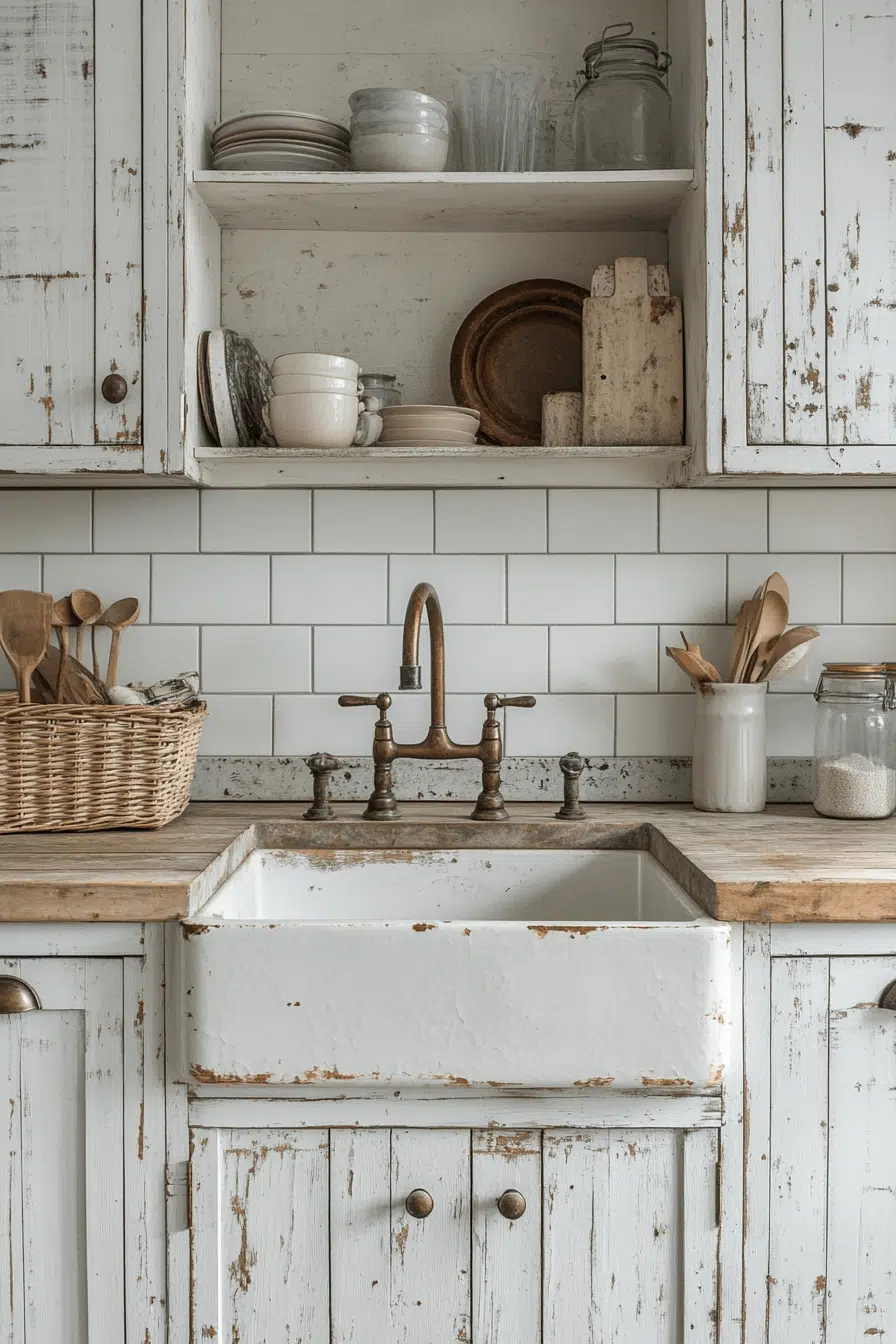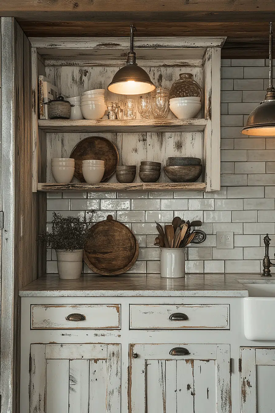Softly distressed white finishes brighten rustic kitchen cabinets while keeping their vintage appeal. The aged paint reveals warmth beneath the surface. This style reflects light beautifully and opens up the space. Paired with wood shelves or dark hardware, it feels timeless. The look is fresh yet familiar. Discover elegant white rustic styles and get inspired!