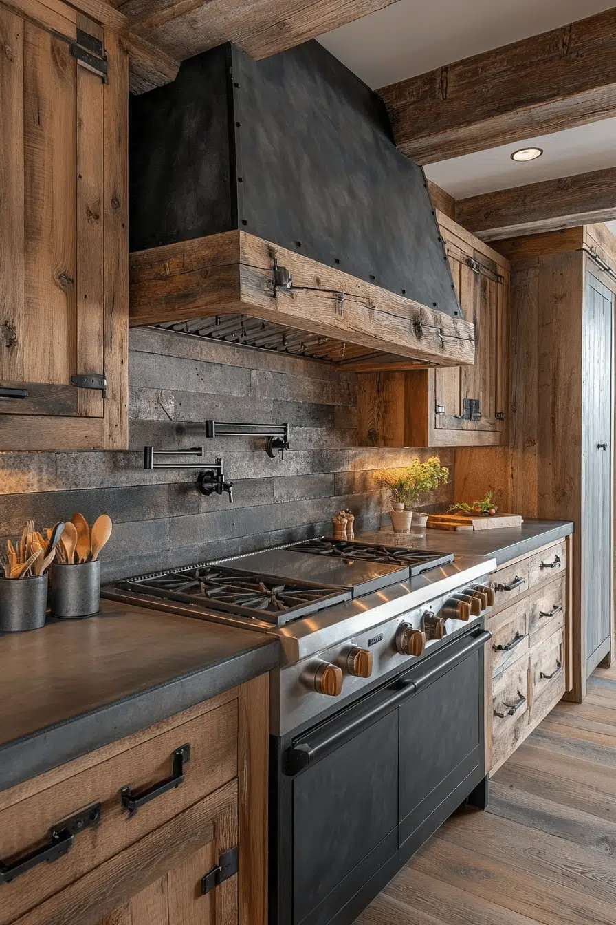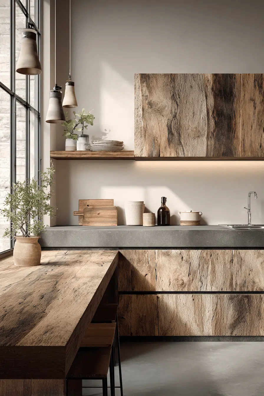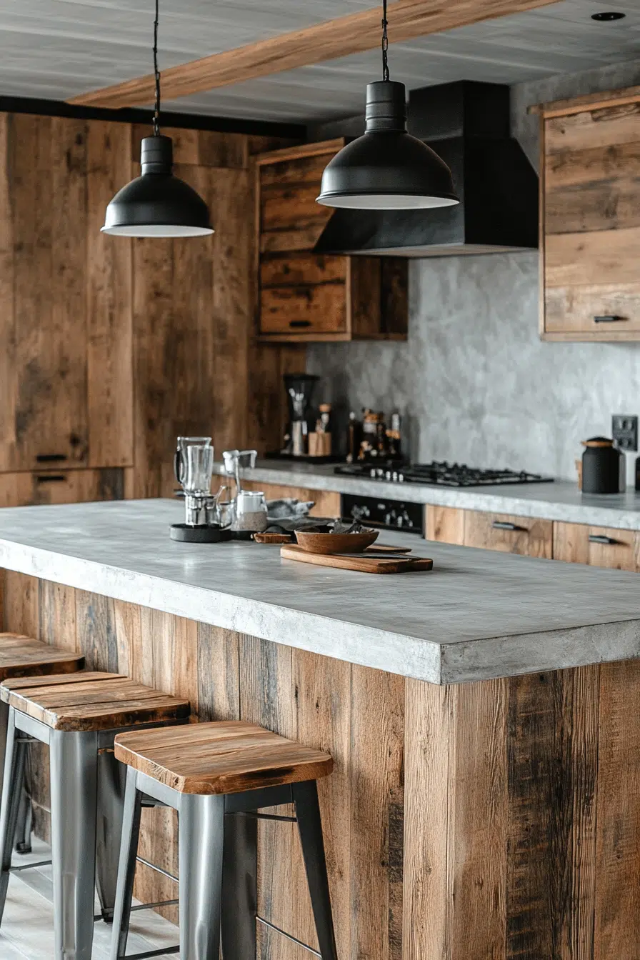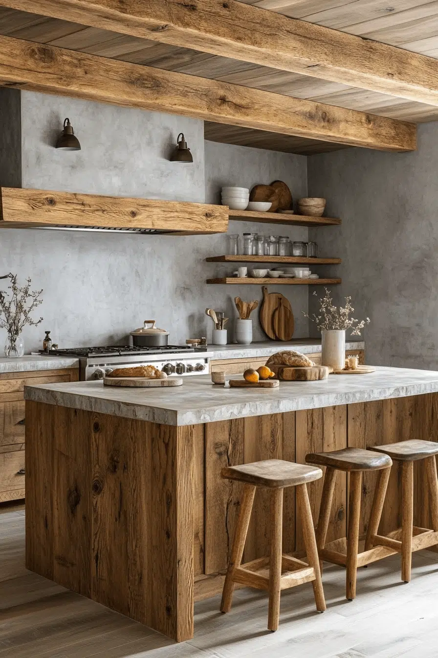 Concrete surfaces create striking contrast alongside rustic kitchen cabinets by highlighting natural wood warmth. The cool gray tones balance organic textures beautifully. This pairing feels modern yet grounded. It works especially well in contemporary rustic spaces. The materials complement each other effortlessly. Discover this bold contrast and get inspired!