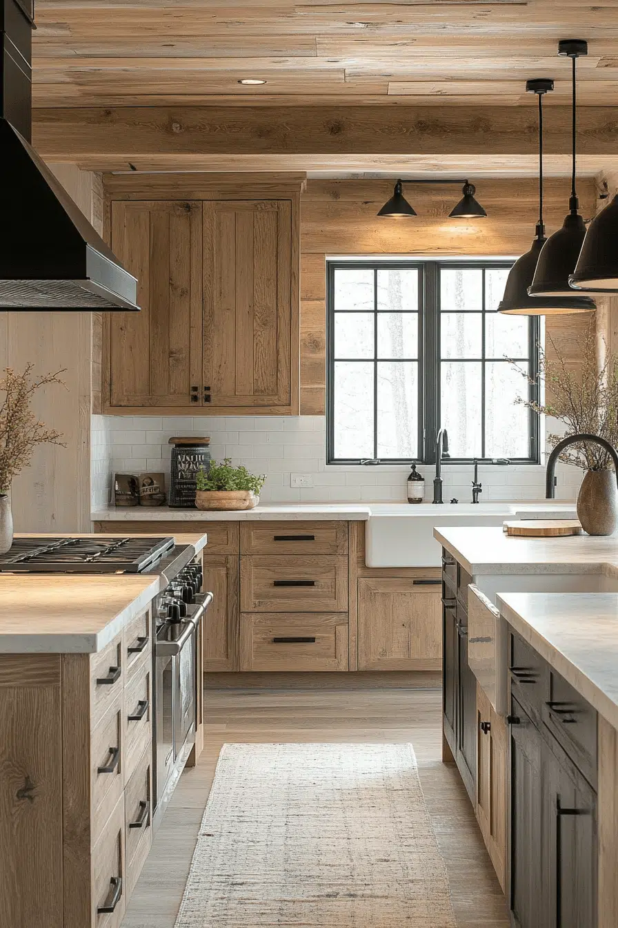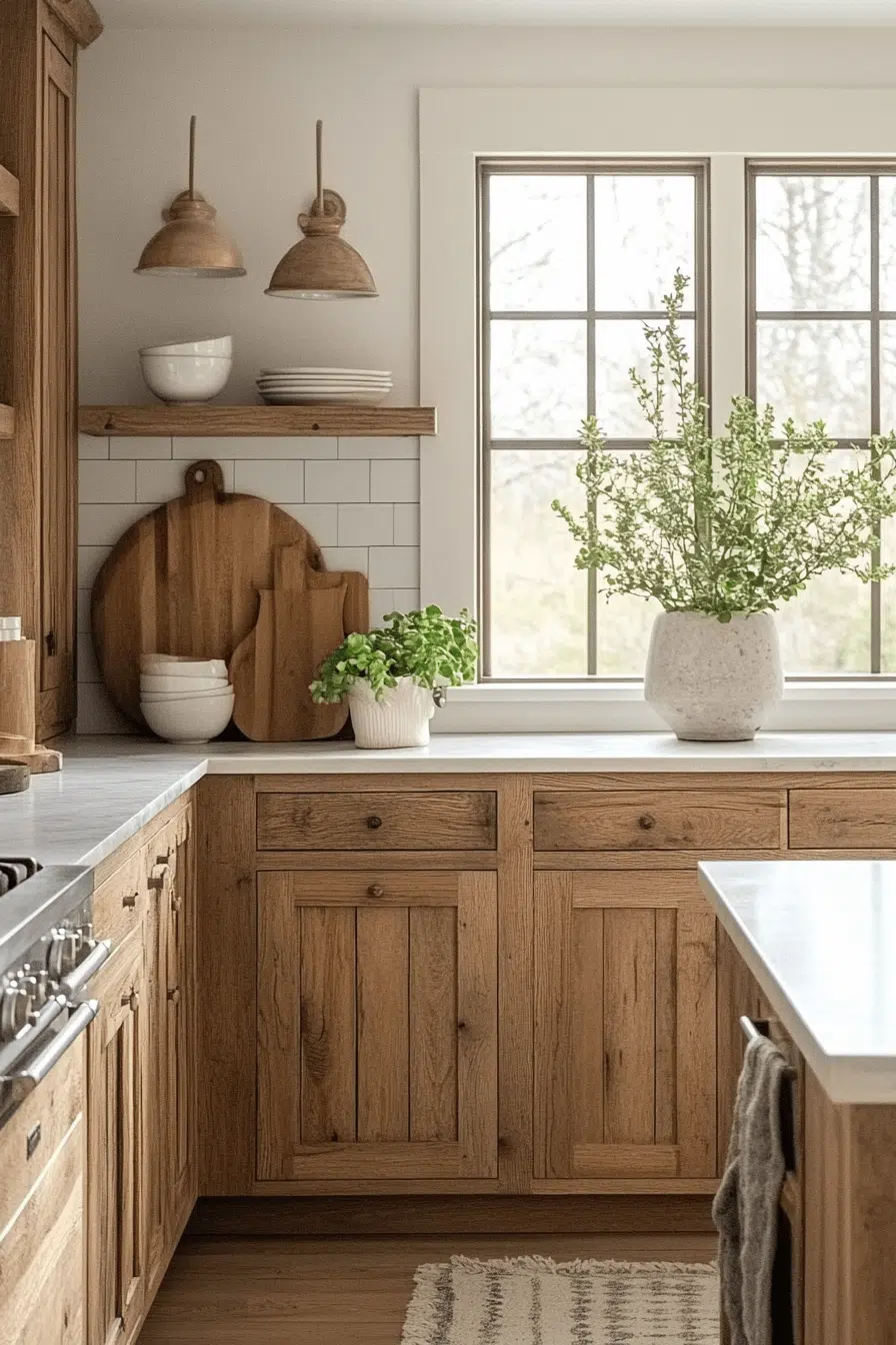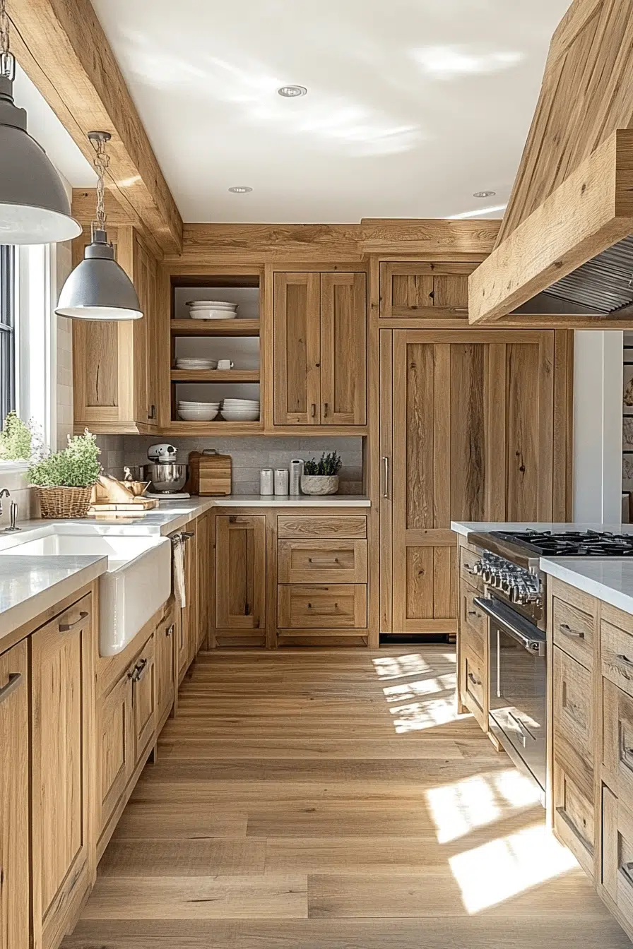 Light oak finishes give rustic kitchen cabinets a fresh, modern personality while celebrating natural wood grain. The pale tones keep kitchens feeling open and welcoming without sacrificing warmth. Paired with neutral stone and soft metals, the look feels calm and current. This style bridges rustic charm with Scandinavian simplicity effortlessly. It’s perfect for kitchens that want brightness with character. See how light oak can modernize rustic style—get inspired now!